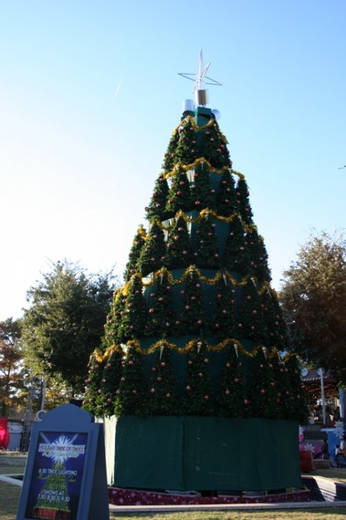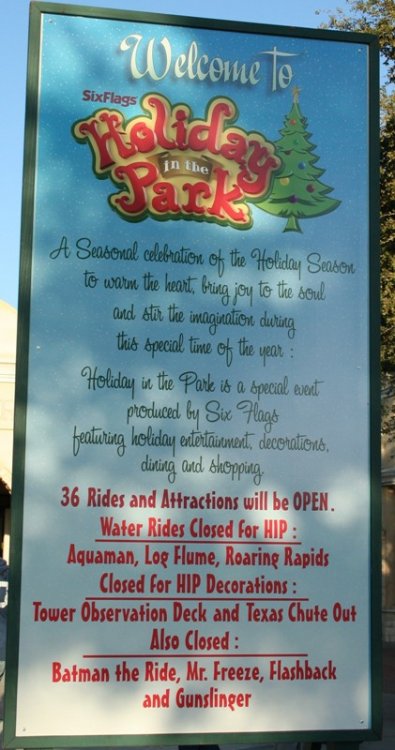 14. Hello TPR peeps! Having told myself after my trip to Cali that I would stay home and save money for the next few months, self said, sounds good, then brain says 1 month later, time to ride again, self didn't hesitate and I made a one day trip (4 hours each way) to SFOT for opening weekend of Holiday in the Park and it was worth every minute. Got to the park Sunday 11/28 at 4pm and made the rounds taking pictures. The park was virtually empty from the time I arrived until I left around 7:45. The lights were twinkling, employees were singing including on the train ride, holiday food items were plentiful (and good), and all rides except for Shockwave (line out the ramp with one train) and Superman (two tower ops) were literal walk-ons. Perfect way to end a long Holiday weekend! I took about 300 pictures of which you will say maybe 15% of them of which I'm breaking it down into two parts. Part I Welcome to Six Flags. The one enhancement I think they could make to get the line moving would be to mirror that of Magic Mountain and have the metal detectors way before the entrance gates. Doing so would increase traffic flow IMO. So, SFOT if your reading, hint hint From the parking lot, Titan is running strong as is the bobsled Inside the park and straight ahead you will find this years Christmas Tree which is full of LED lights that we will see later This is the best time of the year as they roll out food items not normally available. yum 2011 Bottle Pricing This used to be Cartoon Candy Kitchen More yummies. They had deep fried oreos, candy bars, smores, the holiday food offerings were endless This is really what I'd like to see all year round, tailored to the season are these little booths everywhere, gives it a much different atmosphere Tony Hawk is still spinning the singler rider line was slower than the normal line today More delicious food, and yes, the burrito I got was in fact good. My favorite S&S I posted several Texas Giant Pics in the TG thread, but in case you haven't made it there, here are a few teasers I would highly suggest you take a look at that thread, you might just see most of the teal train put together in the center maintenance bay From the train we got a picture of snow hill, and I have to say this was fun. With all my weight behind me I felt like Chevy Chase Mine Train! Wave everyone! *sigh* closed for the season:( opps, forgot shockwave, packed full of awesomeness, I should have went their first, as it got crowded mid evening and Frosty! Mine's Bigger and to end Part I, a sunset shot of Titan.