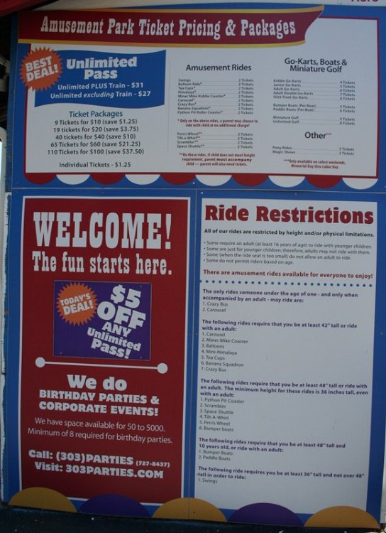 10. 3 Adventures. 1 Day. 1 Sad and Pathetic Person. That pretty much sums it up. August 20th I set out to whore out two parks and ended up with a bonus Alpine Slide! (actually two of them) I'll start this adventure off at Heritage Square Amusement Park at Heritage Square in Golden, CO. (Yes, home of Coors and one of my favorite cities). The Square itself is made up of several independent vendors and store owners as well as three different outdoor attractions that include the amusement park. A Maze and a few other amusement style attractions are onsite but are not part of the amusement park or the Alpine Slide. The park itself has a mixture of family and kiddie rides and is marketed to families. Set in the mountains of Golden, this park offers a scenic view in a clean, laid back atmosphere. You'll be able to score two credits, a python and a miner mike, yes, a miner mike (Just talk nice to them) They actually allow two adults at a time on the miner mike, one in front and one in rear to allow parents to ride with their kids. They also have a tilt-a-whirl (I have a POV of the tilt below, yes, I'm crazy) featured in the classic movie "State Fair" one of mom's all time favorites. So here it is, park one on the day! Excuse my enthusiasm. Well, here we are, I'm already feeling a little...dirty. Two tickets please. Or how ever many it takes. I think I should stop here before I go into the park... Vegas shows in Colorado! And a little information for whores Aiight, so I got a few more tickets, I can't pass up a well ran Scrambler. Ahh, the "Celebrity Ride" Be sure to check out the on ride footage It's a great setting. Donkey rides! The mini golf course looked quite challenging, even more so with a little buzz Jeff Gordon trained here. How about a little porn for you wheel of ferris fans. NASA relocated the Enterprise test shuttle to the park. And the kiddie section, oh, wait, I need to go in here. Yes, yes I did. And I enjoyed every minute of it! But, to restore some of my dignity, I went over and rode this next. And that's it for Heritage Square! I need a nap, and a shower.