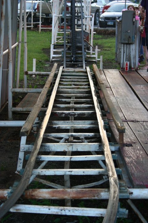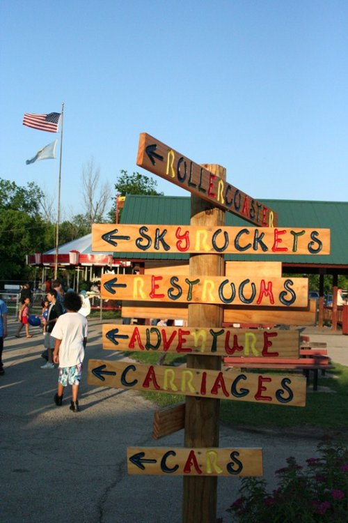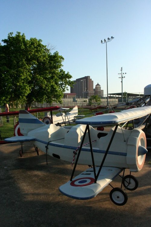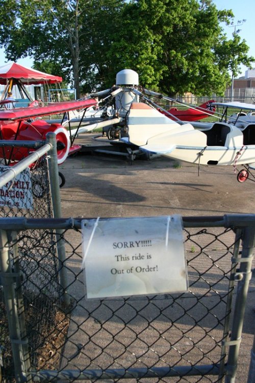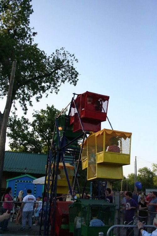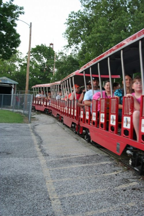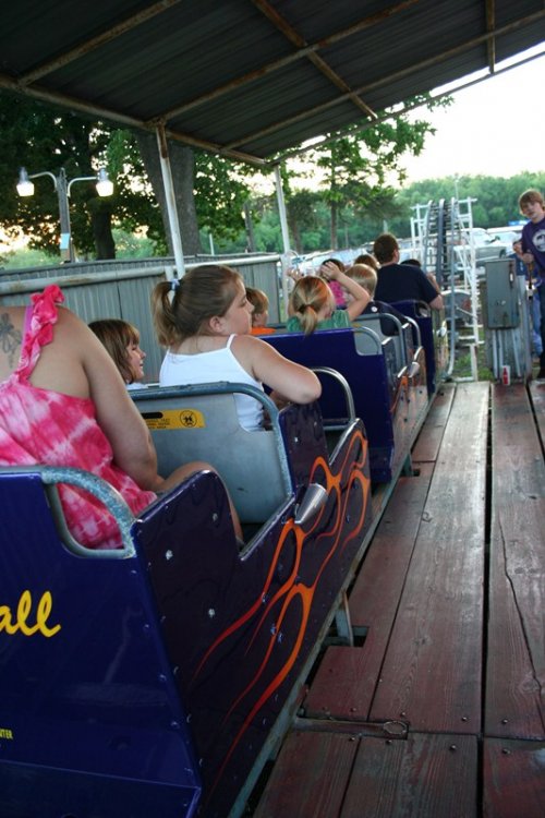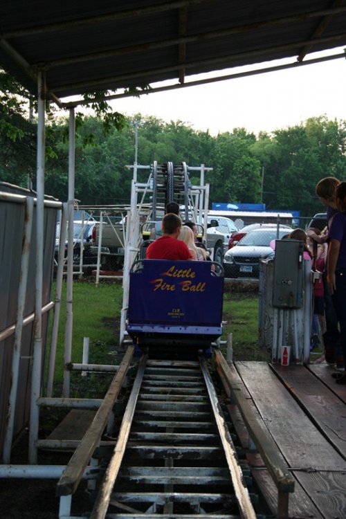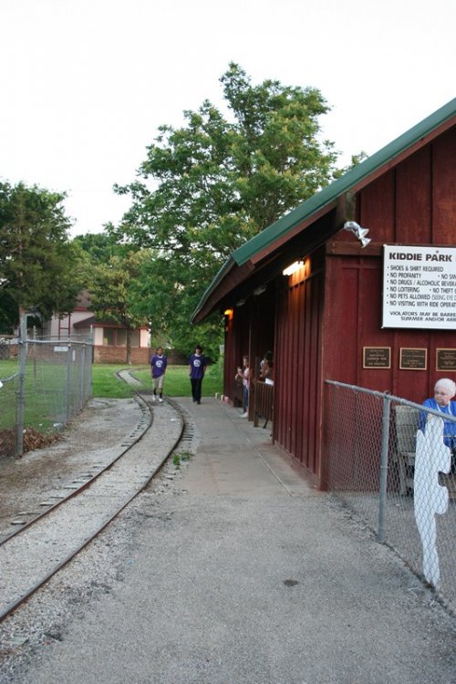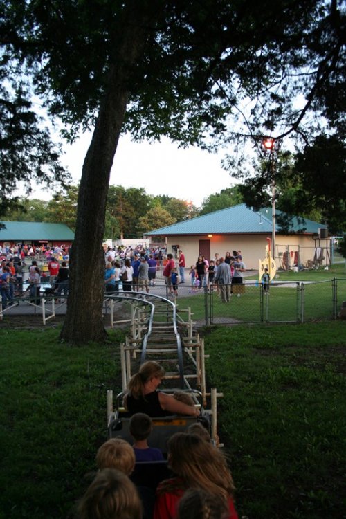 So today I bring you a bit of a surprise, Kiddie Park in Bartlesville, Oklahoma. Kiddie Park has been around since 1947 and is located inside Johnstone Park. Bartlesville is home to Conoco Phillips and the Frank Phillips Home. The town is also home to the Frank Loyd Wright designed Price Tower located in downtown Bartlesville. Parking for Kiddie Park is available along the roadside or anywhere you can find a spot. The park is geared toward, you guessed it, kiddies with a nice collection of old school rides with some dating back to the parks inception. Rides tickets are only .25 each with most rides requiring two tickets. Park admission is free. The park's coaster, Little Fire Ball, required two tickets for three laps. I highly doubt you will find a cheaper credit out there other than maybe free. On this Saturday, the 21st of May 2011, the park was packed with a line of 50+ people waiting to buy tickets. With mom being a school teacher, she asked to go along to see the park. Her last visit was many many years ago and she swears I rode the coaster, but I didn't remember it. So, for good measure, I had to travel back to ride it. Mom became my ride ticket flash pass standing in line about 15 minutes to purchase the two ride tickets while I took the photos below. Overall this a a great small community park thats low stress and easy going. All of the rides are sponsored by local business. The park itself is operated by the Bartlesvillle Playground Association and hires several local youths to operate the rides. Some rides had four ride operators! So if you are in the area, stop by, grab a cheap snack and a cheap credit! Welcome to Kiddie Park! Where "the" last train ride is free! The water got THIS high. Park Rules One of the directional signs. and the other one. We will start off over here with this contraption. And a close up of the ride vehicle. Swing batter batter, swing. This was an odd setup. Ride op sets a timer, turns on the power, then presses a green button, releases the brake, then gives the ship a swing to get it started. The kicker was he couldn't take his finger off that green button! Now this is old school. I'm talking vintage. Speed boats. Teenage Mutant Ninja Turtles? Nope, a real turtle ride! This is where you buy your tickets and junk food. They also had a candy store located in the train station. They also had some old school planes But they were not going to fly today. Air traffic control must have been asleep A caged spinning ride thingy. Even the older kids were riding it. The line for tickets. Swings, with ride op standing in the middle! Mini Bumper Cars! Which was sponsored by a good doc. Something tells me there will be no NASA staged lunar landings today. A brick. I thought this painting thingy was cool. It showed off the town and what it's all about. A Jeff Johnson Credit? Ferris Wheel Wooden horses that go in circles. Creepy character. Ok, so here it is, the original ride sign. Yes, I know, it says Little Dipper. It's real name apparently is Fire Ball, because that's what's written on the train. The course. The Lift. The Train. The People. The Station. Notice the wood brakes. They were squeeze brakes. The Train in Station The on ride photo Yes, I took the kiddie coaster in the rear. A fellow enthusiast was proud of me for whoring it out in the rear. The on ride photo. The business end. Nerd Shot Board here for the last ride of the night. Train parks here. The Train, duh! The Train Cars, duh! Wooden horses running in circles at night. So, you didn't believe me that this park was packed, well, here is some proof! So there you have it, a visit to a real Kiddie Park! -