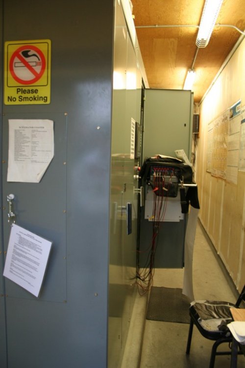 So off to WCB 2011 Day #2 @ Knotts. Knotts, you out did yourself. From the custom made WCB Windseeker Shirts, group photo with Snoopy, backstage tour of the log ride and xcel, not to mention the kick a$$ gifts handed out at lunch, you truly have it going on. May the thumbs of many be pointed up and the blessing of 10,000 suns be bestowed upon you for your hospitality, even in the rain!!! Now, SIT DOWN! and enjoy Part 3 of 5 of my WCB diary and Part I of Knotts WCB! I'll start with the xcel tour. Up at the butt crack of dawn. You mean to tell me that we get to take a tour of the log ride? Holly @#$% that's fantastic! So this is Mark, guru of maintenance. He's telling us not to let our drool dirty up his ride. Ready Nerds? Forward March! The brake fins are made of aluminum and bronze. Catch car, in the station, no train. How cool is that? This thing has three cables, yes three. Thats three times your intamin cable fun. A cable runs on either side of the rail, see the cable? I do. Mark said the car, fins, everything has super tight tolerances, something in the range of a couple of millimeters. And a return cable at the end of the car. train go fast down track when go button pressed boring electronics room You can only get this shot on the backstage tour. and this shot. and this mega super nerd shot. Into the hydro room and we meet their lead mechanic, Mr. Pumpkin. Nerds still making their way into the hydro room, hurry up already! Nitrogen!!!! one of the accumulators for all of the massive amounts of fluid. Motor that makes coaster go fast. Actually, there are ten, yes ten motors on each side. each side is a duplicate of each other. Spare motor The big thing wraps up the intamin cable and makes sure it's all lined up and working properly. This is the other side. At this point, some of us got pulled out to go on the log ride tour so that they could get it open on time. Log Ride > Xcel tour, but the xcel tour was awesome in it's on way as we got to see the big motor that makes it all happen. Thanks Mark!!! -