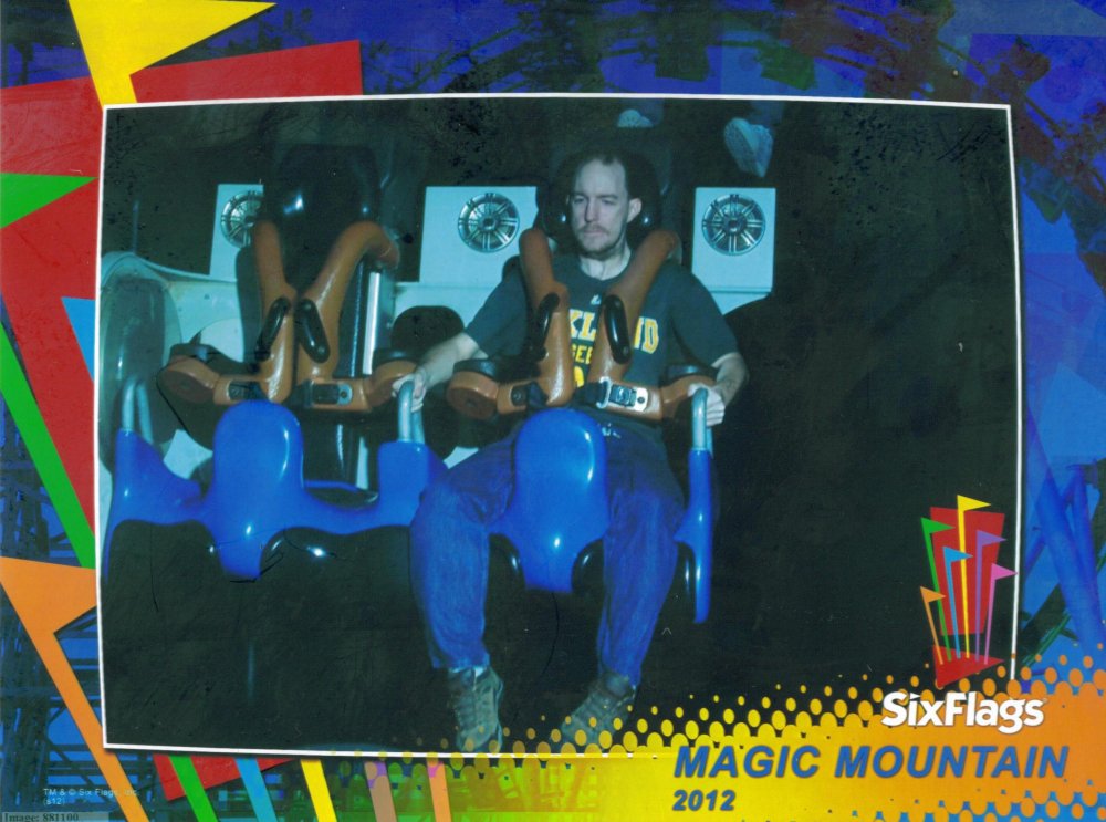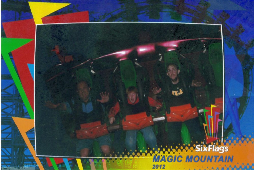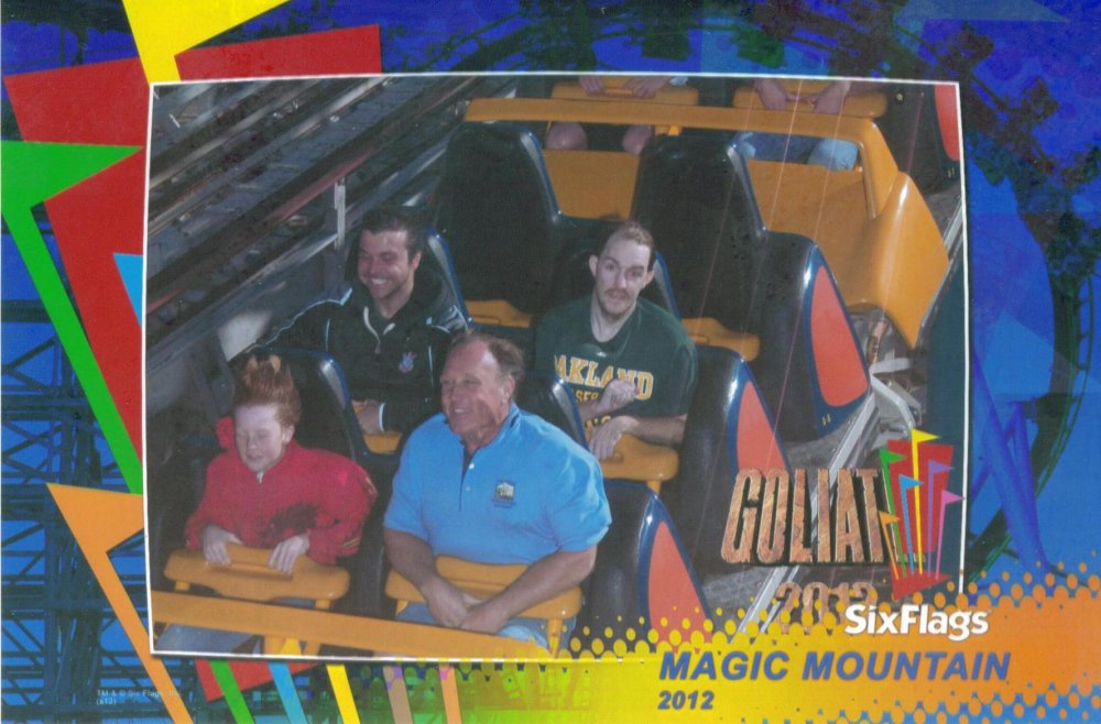 Well im back from my trip to the LA area on saturday the 8th me, my dad, his cousin and his son (my 2nd cousin) *finally* used my VIP passes at SFMM. We drove out of the LA area at like 8;300 and got to the park at 9:20, found the VIP spaces right outside of the ticket booths and waited till 10:20 for our VIP tour guide Joanna (I think.) So she met us in front of will call 10 mins or so before the gates opened and from there we went to. (Note: my dad never went on any ride but the bumper cars and all rides were front seats, no waiting in line.) Goliath which we rode twice in a row without getting off, Lex luther which again we rode twice, Scream once for me, twice for my extended family, colossus once for me, twice for extended family. We then stopped at Ben and Jerrys by colossus/scream where everything was free of charge for us. (Unlimited snacks FTW!) It was then off to Batman which I didn't go on extended family rode twice, Riddler which they rode twice then off to a free lunch at moose burger lodge. After lunch we headed back to where we left off, with me grabbing a extra ride on Lex and the parks poor garlic fries (horrible, seemed like they used garlic powder on it!) After that we took a spin on Green Lantern once for me after being castrated by it and only 1 flip. Again extended family, went on it twice. Off to Apocalypse where I finally ride it twice as well as Superman:EFK. Then Tatsu which we rode once, extended family went twice on Viper and Rev. me and the tour guide told them they aren't good and they are shakey headbangers. Then finally X2 which we rode once in front. We got on ride photos on all the rides that took photo's at least when I got on. I'll scan them soonish and upload them, look freaking retarded on Goliath. and well over 100+ dollars in food not to mention the free photos. All in all even in early dec using VIP (free due to a sweepstake) was well worth it. The crowds didn't seem that massive as summertime ones but some kids had to wait 25 mins for superman when we just walked on to the next train in the front. Its not worth the 299.99 per VIP pass IMHO unless its summer, on a long day and you rarely go to SFMM. TLDR. Ride total for the group. Goliath twice Lex 3 times. scream twice collsus twice Batman twice riddler twice bumper cars (sandblasters) 1 Apocalypse twice S:EFK twice Rev twice Viper twice Tatsu once X2 once I'm the one in the A's shirt, looking stupid. <_> the two in front are my dad's cousin and my 2nd cousin who was barely tall enough to ride everything at the park.