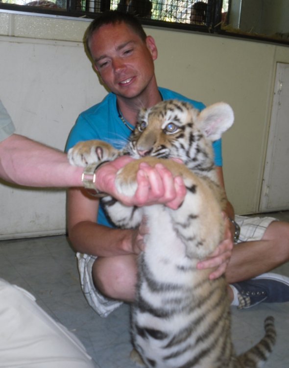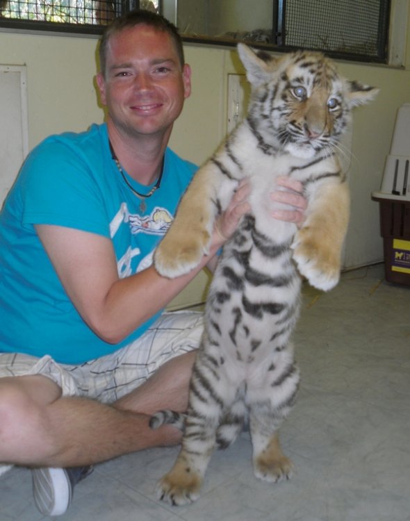 I Must clarify, This is not something that is available to the public or even something you can win. This happened because Bay Area Bash happened (thanks TPR!). While heading back to Tony Hawk for the challenge we stopped Lee and asked if he needed help with the baby tigers, almost as a joke. To our surprise he was cool with it, but just not on that day cause it was getting late. After a few weeks of emails and getting times situated, we're both very busy people, we finally got our times situated and made it happen. We were very lucky to get to do this, those cats are not going to be small for long. They grow almost a pound a day right now and it will not be long before they will be just too risky for untrained people like myself to be around them. I really owe this all to Lee and I can't thank him enough. If you are not friends with him on Facebook I recommend doing it now. Cat in my Lap
