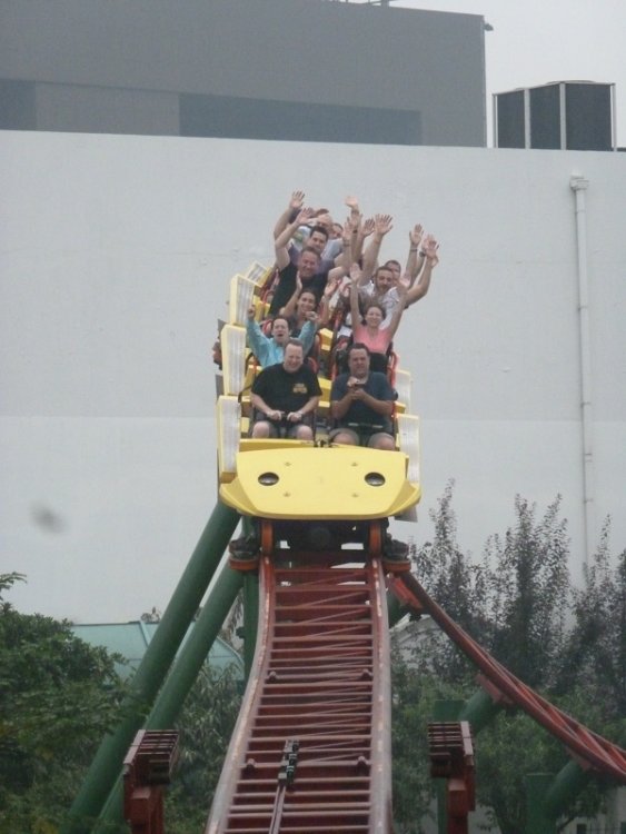5. We're coming into the Chinese home stretch! Chaunlord Holiday Manor was a cool, funky park with lots of charm. Remember that ride from Crab Island? Well, it got stuck here. Thank god for bamboo. Chaunlord had a great haunt, too: Ghost Ship. Yes, they will touch you in there! This funky zipline thing over the lagoon was fun. And we all enjoyed eating Mr. Fish. (Seriously, he was delicious.) Knight Valley's Wood Coaster (yes, that's the name) was good. I don't think any GCI has a better location. Knight Valley also had a show that used a flash flood as a climax. This was, perhaps, the single funniest moment in the whole trip. Robb had the next park located on his GPS, but the guide insisted on stopping the bus and asking random people where it was. All that for a Sliding Dragon. Welcome to another Window on the World. This one had an indoor coaster themed to Vikings or Asgard or something. It was hard to tell, as all you did was bump around in pitch darkness. You could shoot people in the face with a fire hose there. However, you were not allowed to shoot them with this. This was another funny moment at Happy Valley Shenzen. These schoolkids were all shouting "hi . . . hello" at us. They torture yetis here? At HAPPY Valley? Yay! An S&S launched coaster that works! And it was fun, too! I loved their knockoff "Alien Encounter," . . . . . . and, again, you could shoot people in the face with a fire hose. I liked Disney's Hollywood Hotel in Hong Kong, But our first park there was Ocean Park. This funicular was a fun ride to the top of the mountain where much of the park was located. Some of the group warned us that Hair Raiser was "rattly," but I liked it quite a bit. You can't beat Dragon's location, even though the ride itself isn't too good. Best views from a mine train ever! Penguins swim underneath you at Ocean Park. The ride down was spectacular. Hong Kong Disneyland is the cutest lil' ol' Magic Kingdom ever. I like how it's surrounded by mountains. Big Grizzly Mountain is currently my favorite Disney coaster. Their version of Space Mountain is a clone of the West Coast version, but they were running Ghost Galaxy while we were there, It was great. Save the Animatronic Hippos! I liked the finale of Hong Kong's Jungle Cruise. First fire, . . . . . . then water! Of course, Dumbo is universal. I'm looking forward to visiting this park again. It's changed a lot since 2012. That's all from China!