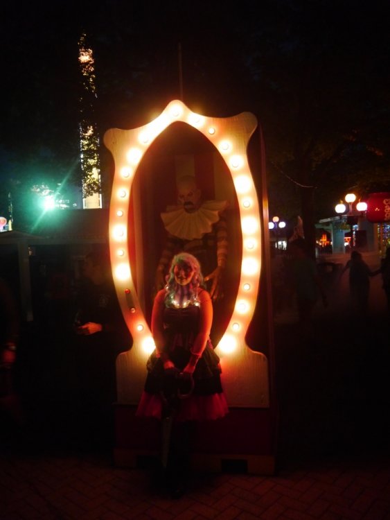 Media Day for Howl-o-Scream: 20 Years of Fears Busch Gardens planned their Howl-o-Scream media day for earlier in September, but an unexpected guest, named Hurricane Florence, persuaded them to change their plans. Fortunately, the hurricane didn't hit Williamsburg, but better safe than sorry; then again, howling winds, thunder, and lightning wouldn't have seemed out of place, either. So, the park treated the media (local TV and "bloggers") to a peek at this year's edition--the 20th anniversary of Howl-o-Scream! Hard to believe, but I've been around for every one of them. Perhaps I'll end up haunting the place myself someday. How is the park celebrating 20 years of fears? How about with three new mazes? The Vault: XX--Think of this as "Howl-o-Scream's Greatest Hits." Favorite children of the night have all come together to scare guests in what used to be the station for Drachen Fire near the Festhaus. Look for the Executioner from the Dark Tower (the first HOS maze), Scarlett from Unearthed, Mummies from the Curse of Pompeii, the Pirate Captain from Sea Dog Cemetery, and many more. I think this is the best of the new mazes. Demented Dimensions--"The energies of a dimensional vortex" have twisted and distorted the rooms of Sterling Manor (and the neighboring Victorian Street) into a new haunted realm where strange creatures dwell and reality simply doesn't matter. Get demented inside of the Ride Formerly Known as DarKastle. Dystopia--There's a "new order" in charge of our world (or at least the part of it under Escape from Pompeii). "Join--or be forgotten!" Returning mazes for this year are Frostbite (creepy ice monster inside the old DarKastle show building), Cornered (an evil corn maze behind DarKastle), Lumberhack (insane lumberjacks with chainsaws, axes, and one big buzz saw in the woods behind Verbolten), and Cirquo Sinistro (terror under the Big Top in Festa Italia). Daring guests can stroll (or run screaming) through two new Terror-tories (that is, "scare zones") this year: Garden of the Souls--In Italy's Funeral Gardens, guests can visit the graves of the deceased--or with the deceased themselves. Fools' Court--Chaos reigns in France when motley fools roam the streets. The joke will most likely be on you. Other scare zones include Jack the Ripper and his minions in England, scary Vikings in Fort New France, bloodsucking vampires in Germany, and evil clowns and circus freaks in Festa Italia. This year also marks the return of Jack, the event's oldest icon and trickster, after an eight-year absence. He hangs out in Vault XX and in No Escape: Jack's Nightmare Room (this is an up charge). Jack said that his old show at previous events was a "a bit too family friendly" for his taste, and he's hoping to really get back into scaring people this year. It's good to have Jack back. Guests can help Jack and the other fiends scare people at the Control Lab in Ireland. For a slight fee, you can push a button and scare the crap out of some random person on Festa Bridge or in the Vault, Demented Dimensions, Dystopia, and Frostbite. While you're at it, a Naughty Nurse (or perhaps Dr. Freakenstein) can serve you a nice Jello shot or cocktail in the Inoculation Station. There are two party zones, and three shows, too: Monster Stomp on Ripper Row in England, Fiends in Ireland, and Night Beats--Revamped in the Festhaus. Howl-o-Scream is part of your park admission (no separate ticket required); however, some activities inside (such as escape rooms) are an up charge. So, let's have a look at the Control Lab, Vault XX, Demented Demensions, and Jack's Nightmare Room, shall we? (Oh, very well, I'll go first.) First stop, the Control Lab in Ireland. There were no inoculations today. Dr. Freakenstein was very busy. "Tell me about it! I've been waiting to see him since 1842! Never gonna get my bleeding at this rate!" But the good doctor did provide us with cookies . . . . . . and witches! (She would like everyone to know that she isn't dead--yet.) Clowns. Why did it have to be clowns? Here's the Control Lab. Just push a button and watch the fun on the monitor as something scares the crap outta somebody! Of course, if ya play, ya gotta pay. Dr. Freakenstein doesn't work free. Time for a nice, relaxing tram ride to . . . HOLY CRAP, WHO IS THAT? This one is loud--very loud. Jack, buddy, how ya been? Jack gave us a personal tour of Vault XX. Here you'll find remembrances of Howl-o-Screams past. Sheesh! Again with the clowns! Looks like Dr. Carver's evil doll escaped his No Escape Room. Scarlett (from Unearthed) has been playing a little solitaire. Hmm--I think this could be the Dark Tower . . . . . . then again, it could be Sea Dog Cemetery. I asked this guy, but he was a bit of a stiff and wouldn't answer. One of the cages from the Catacombs. Hmm--can't place this one, but they look a little annoyed about something, The Lady of the Gardens--one of HOS's creepiest past icons. The Witch from Cursed is happy to be indoors this year. And we all made it! Whew. More to come -