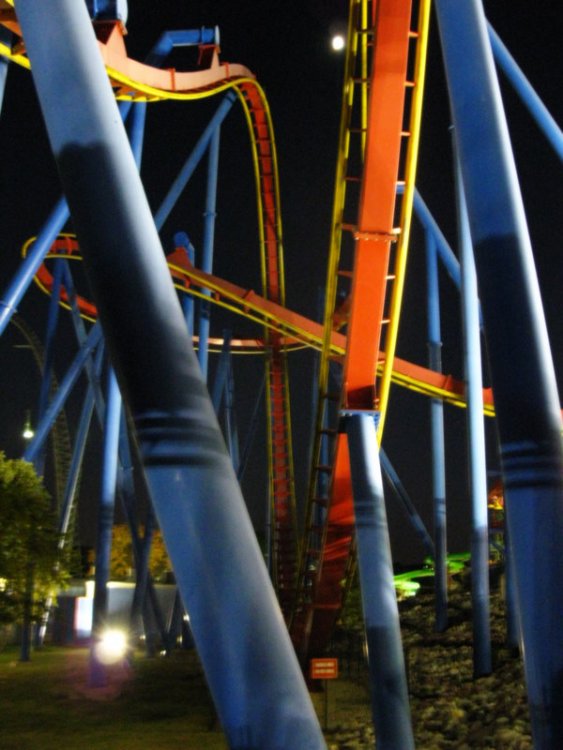 ^ KD, I just don't zoom out as far. That's why I couldn't get the entire park in one shot. 1998 20th Season I went to the park late yesterday on my way home from work. There isn't a whole lot going on as far as next season goes, but you can tell that Undertaker has brought in more guests - the park was packed! With new owners in place, everyone is waiting to see how Premier handles these parks. We should begin seeing the real changes in a year or two. Hopefully they are for the better! The Gotham Backlot lately hasn't been as crowded - I guess since it's the dead end of the park. Chaos was closed for most of the day. There's been very little movement in this area. It makes one wonder if this area of the park will ever be developed. "What do we ride next?" "Batman!" Undertaker is beautiful at night. Night rides on any rollercoaster are the best! - Joe