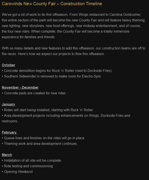 Here is the timeline for the 2017 construction also the wewbcams are up and going. For those who were asking is the family water slide complex that most thought wasn't moving in fact is being removed. they have not said whether or not it will be moved to another part of Carolina Harbor or gone for good. https://www.carowinds.com/blog-article/online-fun/2017-Construction-Begins -