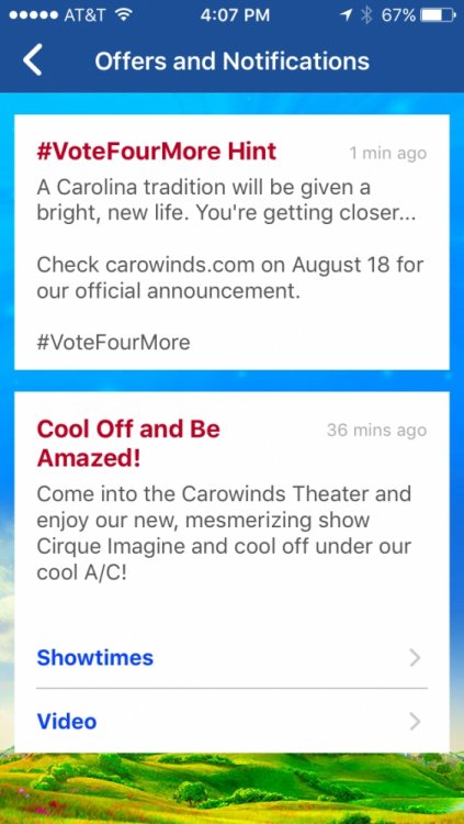 So today I got these notifications. Obviously I was near Vortex for the Cirque imagine show and the one at the top alerted me as I was walking on the side of Cobra headed towards White Water Falls. -