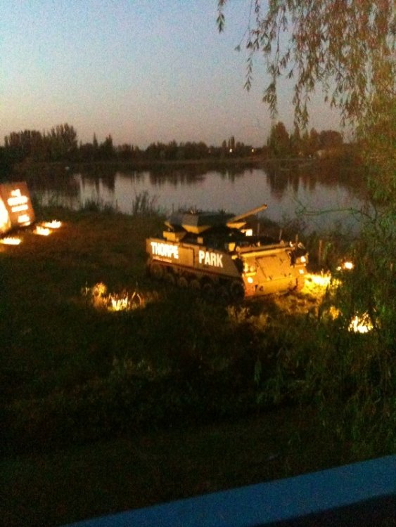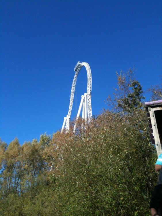 So it's been a long time since I have posted or even been logged on this site (exams, school, hobbies, friends, busy) but I visited Thorpe Park yesterday and thought that I would write up a quick review of my day with a few pictures (taken on my iphone 3gs) I visited with my Aunt and Uncle and we had a great day. Thorpe Park was running a "Fright Nights" theme for the Halloween period. This meant that the park was opened longer (from 10 till 10) and had some cool mazes and theming. From 4 o'clock the mazes are open to the public. This year there were four mazes, a magic show, Saw Alive (the year round horror action maze) and the rides were also open until closing. We didn't do any mazes but spent our day riding and chilling! My Uncle was very helpful and booked fastpass tickets for Nemesis Inferno, Stealth, Saw, Colossus, X:/No Way Out, Loggers Leap and Tidal Wave. Most rides were very busy and I should congratulate the park for having a fabulous free app giving up to date wait times. Anyway, the rides! Firstly we rode Loggers Leap and Tidal wave. Both were very enjoyable and a good start to the day. The rides were very thrilling but would also be appropriate for the whole family. One of my favorite elements of Loggers Leap was the drop in dark which was surprisingly long! We then rode Colossus and Nemesis, My least favorite of the coasters however fun! The number of compact inversions is amazing! X:/No Way Out was rather standard and isn't worth waiting in line for. I guess in a way it delivers what it promises, A feeling of being trapped and out of place. The whole ride is backwards and in semi darkness apart from strobes. The ride stops at various intervals which adds to the feeling of disorientation. We then rode Saw which was surprisingly well themed and actually managed to scare me a lot! The queue is very well themed both outdoors and in. Sirens sound and screams are heard as you board. After passing jigsaw and turning a sharp bend you face two large pendulums which you drop under sharply before being turned upside down in semi darkness. The coaster section is extremely smooth although very short. Finally we rode Stealth at sunset (Picture at bottom) It was a lovely ride. I expected it to be very rough and distorting. It was however lovely and I loved it. The new ride "Swarm" was advertised a lot and the entrance is even in place. It seems to be some kind of 4th dimension coaster. We finished our day in the bar! I would recommend the park for families and those who are looking for a thrill. It has something for everyone. I hope you enjoy the very few pictures below. Stealth rises high above the trees! I approve of Saw! Without train... With train... The new "Swarm" theming!