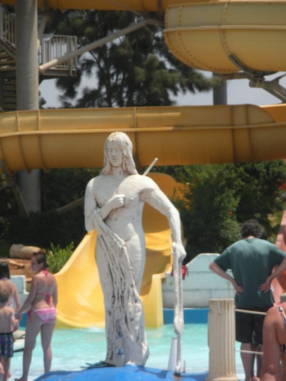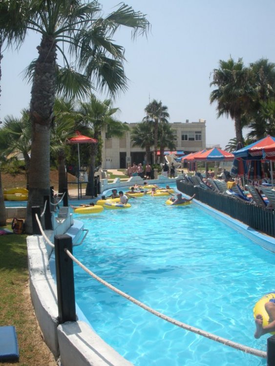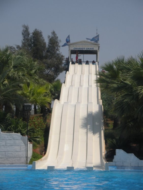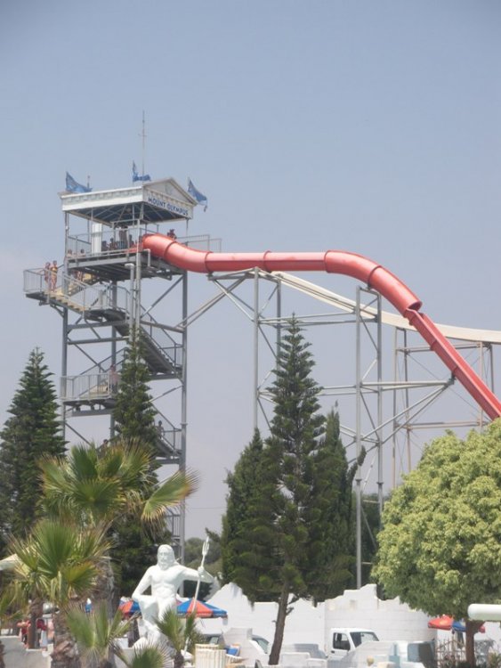 Last week I was in Cyprus for my cousins wedding. We all had a great time! On day four all of the under 40's went to the local waterpark, WaterWorld! The park is nice and boasts quite a good selection of rides to keep all ages busy. It is "The only "themed" waterpark on the island" and the theme is Greek mythology, the gods and stuff like that. WaterWorld is situated VERY near to the sea about ten minutes drive from Agia Napa. Admission for us was 32 Euros each as we booked a transfer service which comes included in the price. The park boasts 18 attractions. As it was a rushed "family" day I could only take a few pictures, so here goes. The park entrance... First up was the Lazy River...It was basic but fun! The Kamikaze slides were at the very back of the park, the white one was closed I see a tipping bucket!!! You are constantly reminded where you are! Drop To Atlantis was probably the most "themed" slide with light and sound effects! Twisty fun with long queues! These guys made up the "theme" The racing slides! I became airbourne! There was a Fish Spa right in the middle of the park! The "kiddie" area, the adults joined in too! Thanks for a fun day WaterWorld!