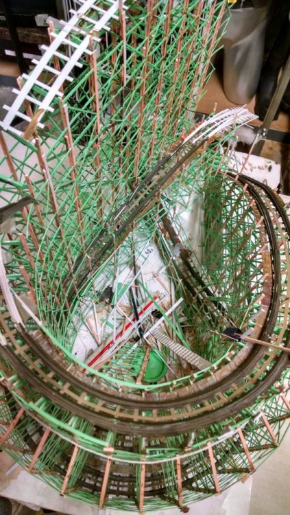 Preparing to lay track over the very tippy top of the ride. From the above you you can see all the layers of track. Thanks to a coworker who used to build model trains for giving me some left over materials and the box I found that still had a few drops of glue still in it. Contribute today to help finish this model in the professional display which it was intended. -