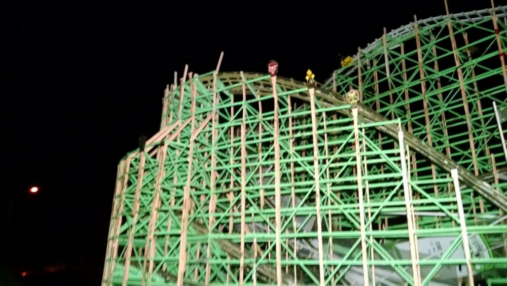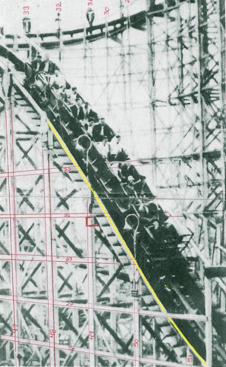 I was taking a closer look at this part of the first drop where it seems the handrail splits and goes in two directions. I began to wonder if the first drop of the Airplane was raised a few feet (ala CIC). The yellow line indicates the old handrail (profile) and the newer red one. In the last photo it even seems the cat walks have been raised to near the height of the original handrail (close to 3 feet). The yellow rail is the original. The red marks are for my own reference The split it even seems the cat walks have been raised to near the height of the original handrail (close to 3 feet). -