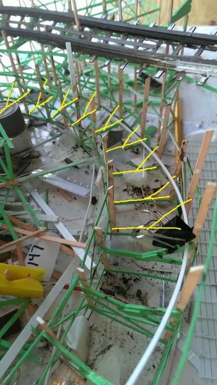 100-view update: The frame for this turn is 95% finished. I am out of supplies (mostly 2x2s) for the sub track so I'll have to work on something else while I wait. Ready to fill in the gap over the top of the hill. linking the two ends together is much easier than one would think. After I add the spine of ties. A view from underneath Still need to lay sub track on last half of the lower run. But the shape looks nice I think. -