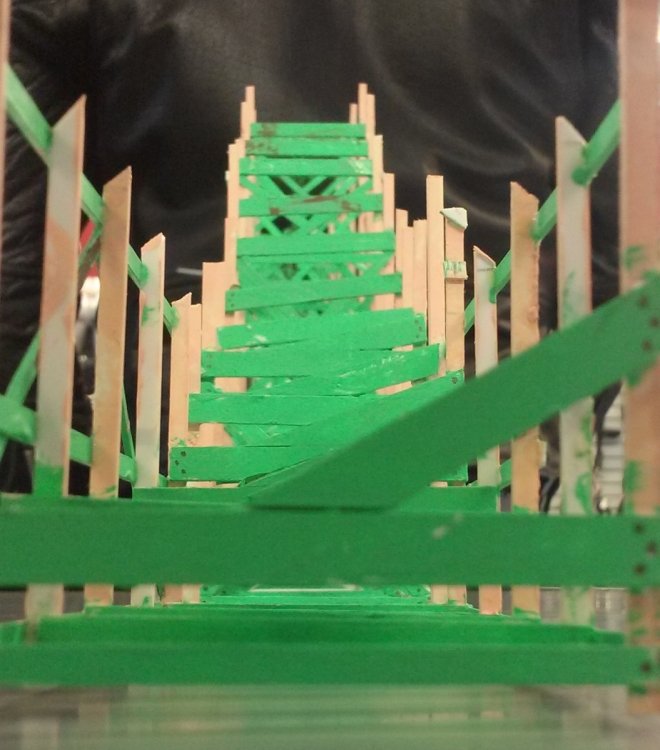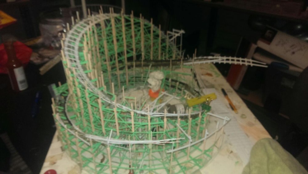 StLCPfan, Thanks~ I knew that day was coming and I could have kept it in a safer location. I tried that once, but was then unable to work on it at all, some reason I need to close by. Dennis is disabled and prone to serious panic attacks, especially when it comes to abandonment. I'm scheduling an attorney appointment to have him removed from my house as he refuses to go anywhere on his own. Anyway, here are a few photos I originally intended to post before the unfortunate incident. It does not hamper my drive to complete this model, which by the way, I have set the completion date as April17th, 2015 - Three years after this post was created! BTW, I LOVE your idea. I just might do that! This shot reminds my of a Pisces. This is the second spiral and the home-bound track that wraps around it A near pov angle Construction begins on the third-highest climb up towards the second spiral. Again, anything white will be trimmed away after I place on all the ribbons and lateral cross bracing support. Top view of the above section, I find that the horizontal "X" braces really sturdies up this piece so I can fit it in to the rest of the spiral with minimal bendage. -