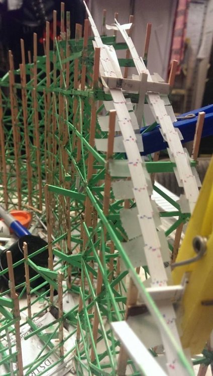 While I'm waiting for more supplies so I can continue the spiral, i decided to bring out the lift hill and begin repairs. In the past year it's been handled too much from moving it around and using it in photos, and showing it off. The red markers are the joints I have to replace or reglue depending. It is worse on the other side. -