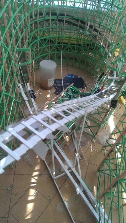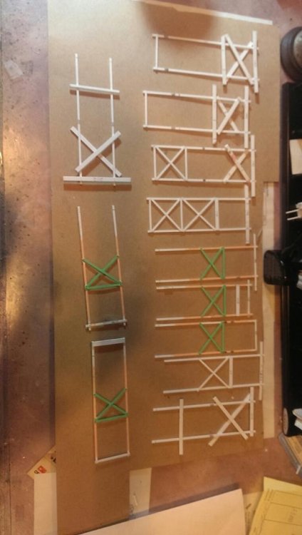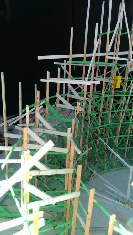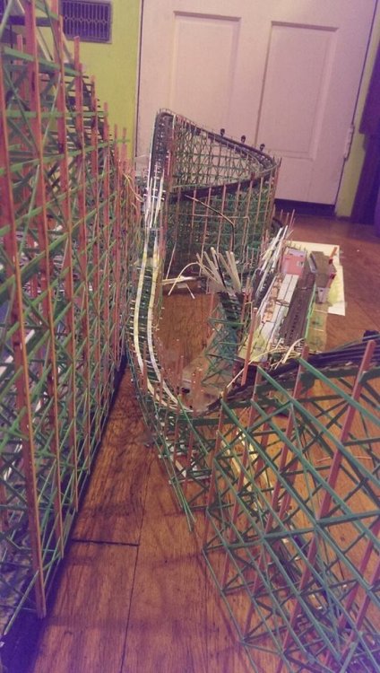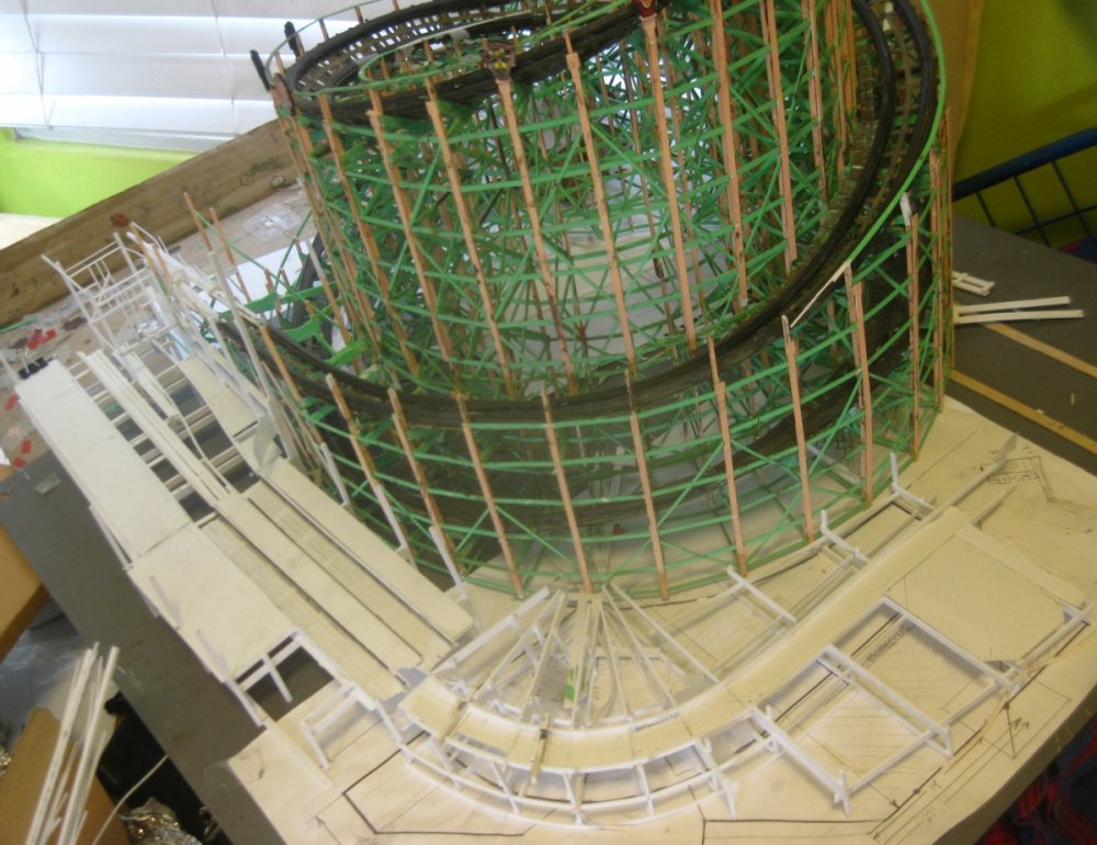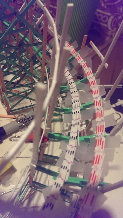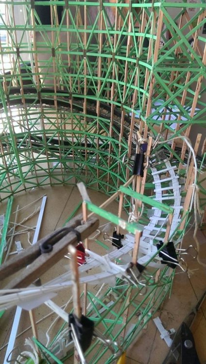 Next month it will be two years since I started bent construction on the Airplane Coaster Model. Two years, good God... Anyway, I learned a lot and I'm still always improving my techniques. They have changed quite a bit since the early days, all templates and other tools altered at some point. The manner in which I erect the bents has improved a great deal. Here are some basic photos as how I built the current sections. Erections are faster heh heh. Basic starting pieces. Cream colored uprights and green buck-braces, measured and scored. The bent making template is the board at the bottom. I LOVE this score and snap method, taking pieces as I need them. You can see tape holding each section down where the score is. After I remove a row... I clip the corners off to make the buck-bracing - snip snip snip I made a 5-bent ground grid that can accommodate four different radiuses. I copy the same four-space pattern several times until I get a whole circle. This prevents the drifting problem I was having before. These are two sections about to be married together. On this section I'm trying two new methods. First, I am not worrying at all about having the ledger boards perfectly placed on the bents before I erect them. Second, I am overbuilding the bents to keep them aligned better during construction. This is especially good for keeping shorter bents stable as I put temporary cross bracing ABOVE where the track will go. Here is the very basic structure. Upright bents spaced evenly apart with temporary thick white spacers keeping everything square, stable and upright. Then I add the permanent green horizontal ribbons, spaced 10' (2") apart. Then I add the diagonal diamond braces. To link the two sections together, I thread the alternate in-between ribbons (so all ribbon boards are 5' (1") apart through the diamond diagonals. It's staring to take on its famous familiar shape. -
