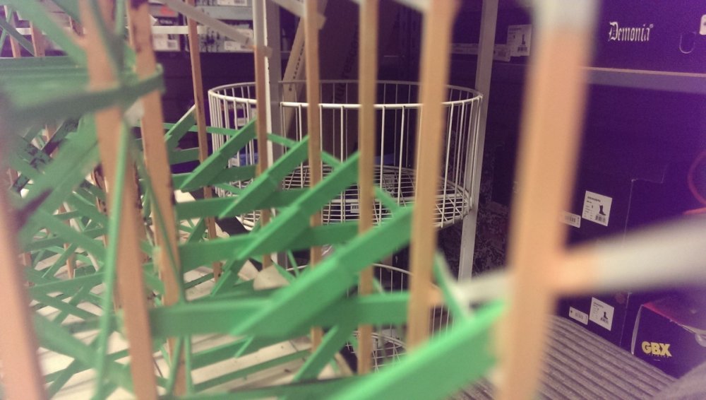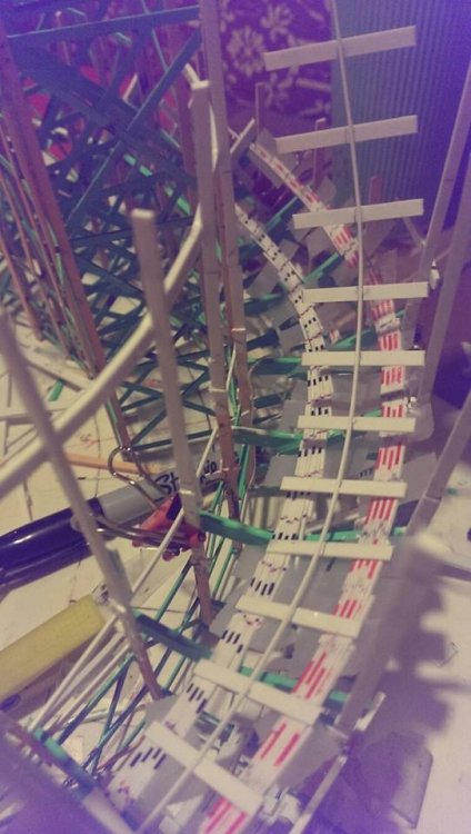 All 36 bents that make up the 2nd spiral are built and erect. Right now, the spiral is in 5 sections. Next is to join them all together, add ledger boards, track and catwalk. I make it sound like it's almost finished. It took 8 months to build the first spiral, part of that due to a broken arm 1 year ago. This section: 2 weeks. -