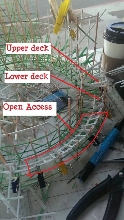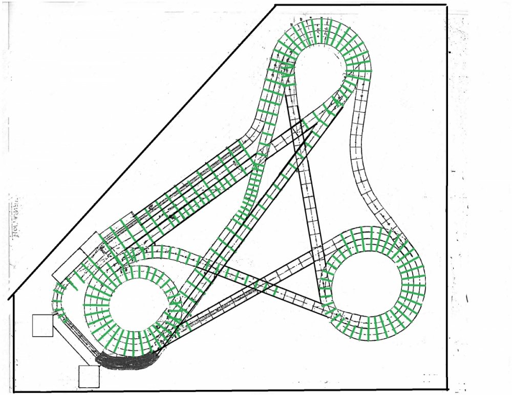 A huge challenge is trying to weave little strips of plastic through an area with minimal access. For example, I'm laying subtrack for second spiral, after it comes off the drop and makes a 135 degree circle at near ground level. But there will be another run of track about 10 feet above that track. When I built the bents, I could have left off the top deck to make laying track on the lower deck a lot easier. But without the top deck, it would have left the lower deck very unstable and I would have had problems with pieces coming off or getting out of alignment. I needed to have the structure for the upper deck on to make it all stable. So, rather than try to dig deep in the bowels of the structure to try and weave subtrack on the lower deck, I'm using an "open space" (before it dives under the upper deck) for the weaving. Then and after I put the ties on, I feed forward what's assembled into the hard-to-get-at run. It's all banked the same so that's not a concern like it would have been somewhere else. However, there is a radius change where the black line is. For the tighter radius, I'll have to go in through the opposite side and then try to weave the two ends where the black line is. The open weaving and building area is within the red boarder. Then, I thread the assemble part forward into the hard-to-get-at area. Then I will weave some more subtrack, add ties, and repeat. Once it gets to the black line, the radius changes so I'll have to start that process on the other end. -