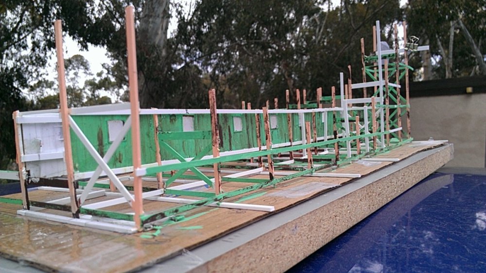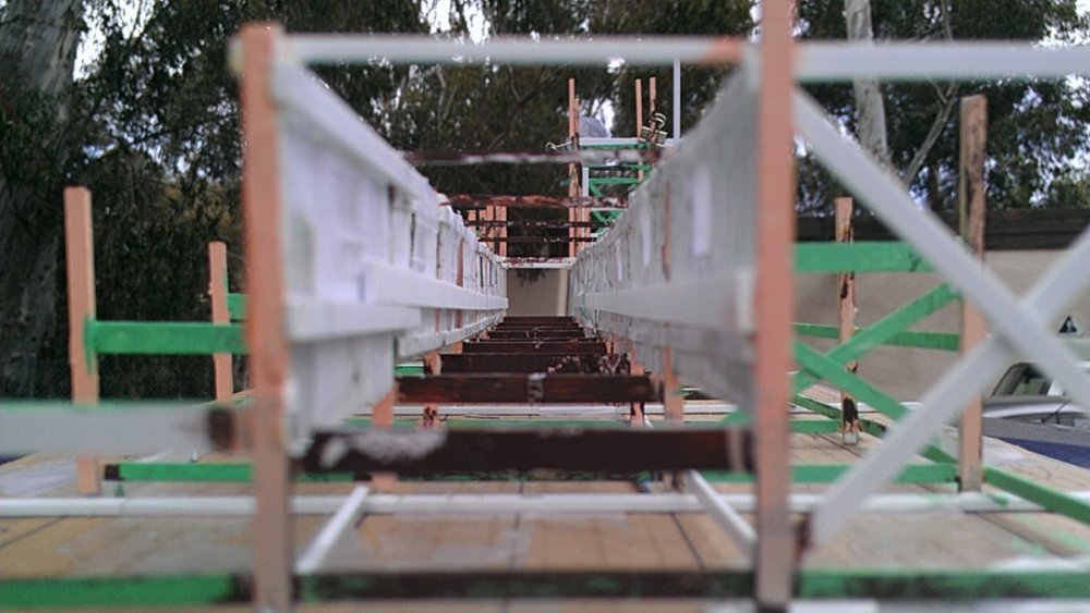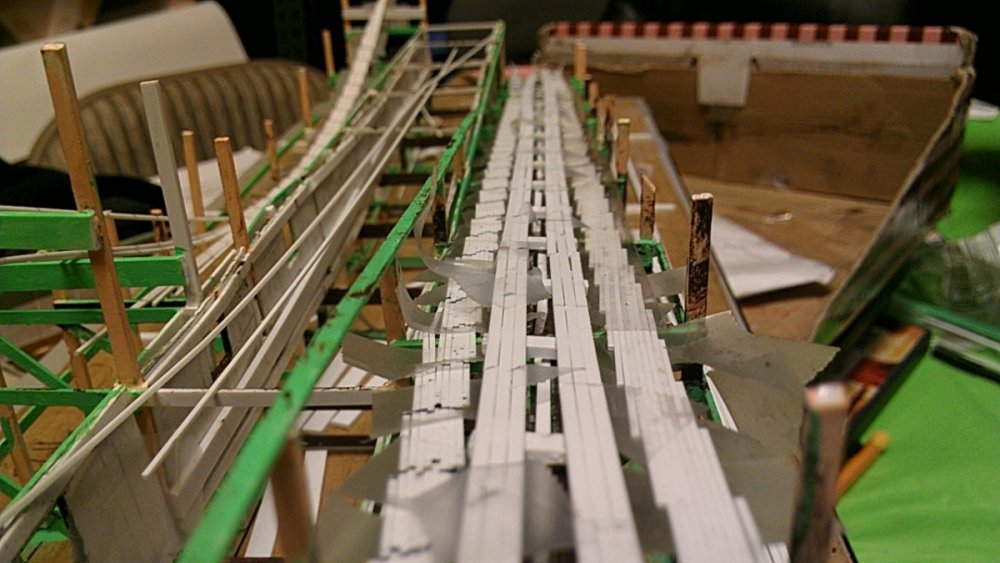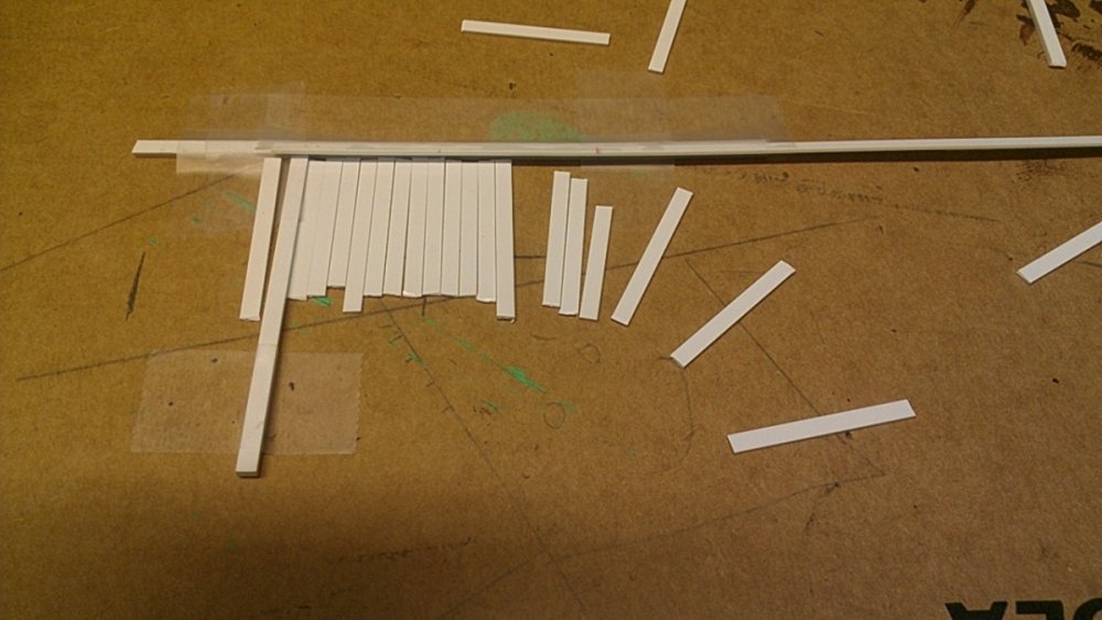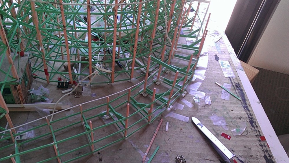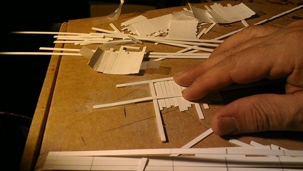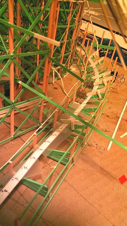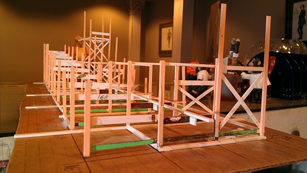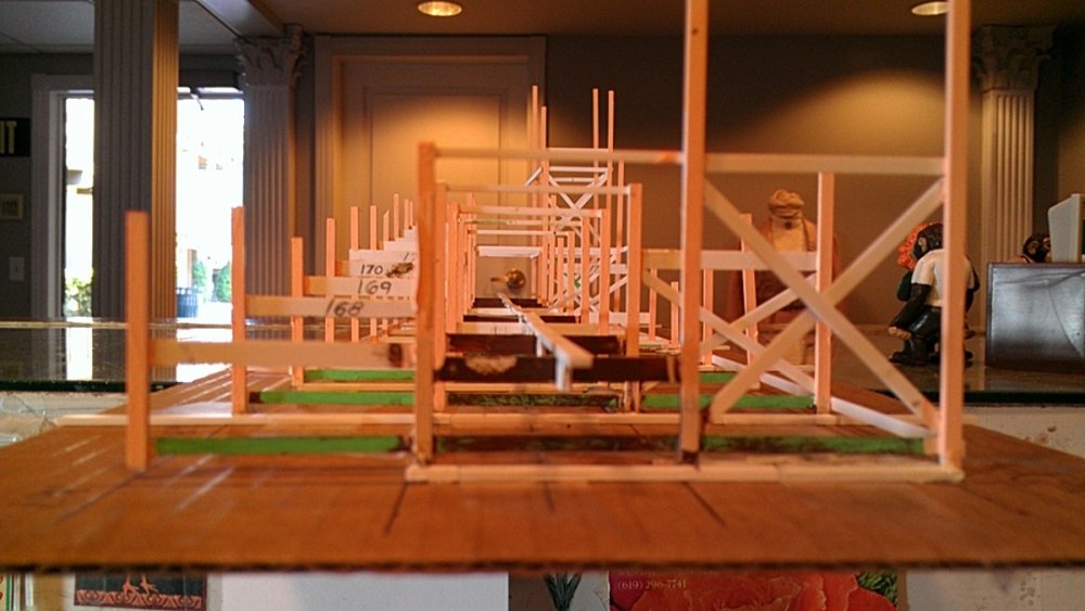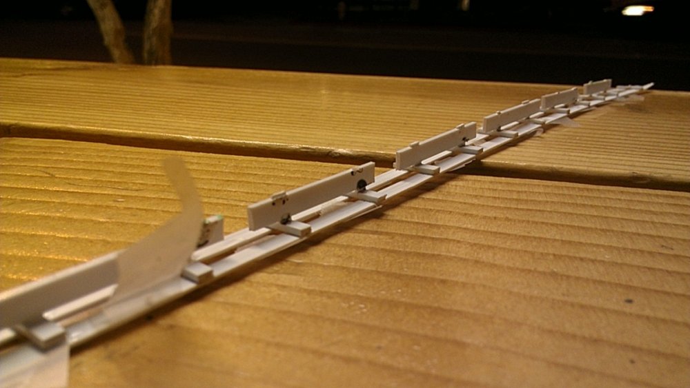 MAKING FLAT CATWALK Most wooden coasters don't bother to put cleats on catwalks where they lie horizontal. To make those, I put three scaled 2x8's together, leaving a hair of a space between them. Then I tape every inch or so. Then, I paint the untaped side. To get in the cracks, I peel the three pieces, keeping them taped. This way, I can paint into the seams. Then measure and cut, and glue. To make those, I put three scaled 2x8's together, leaving a hair of a space between them. Then I tape every inch or so. Then, I paint the untaped side. To get in the cracks, I peel the three pieces, keeping them taped. This way, I can paint into the seams. -
