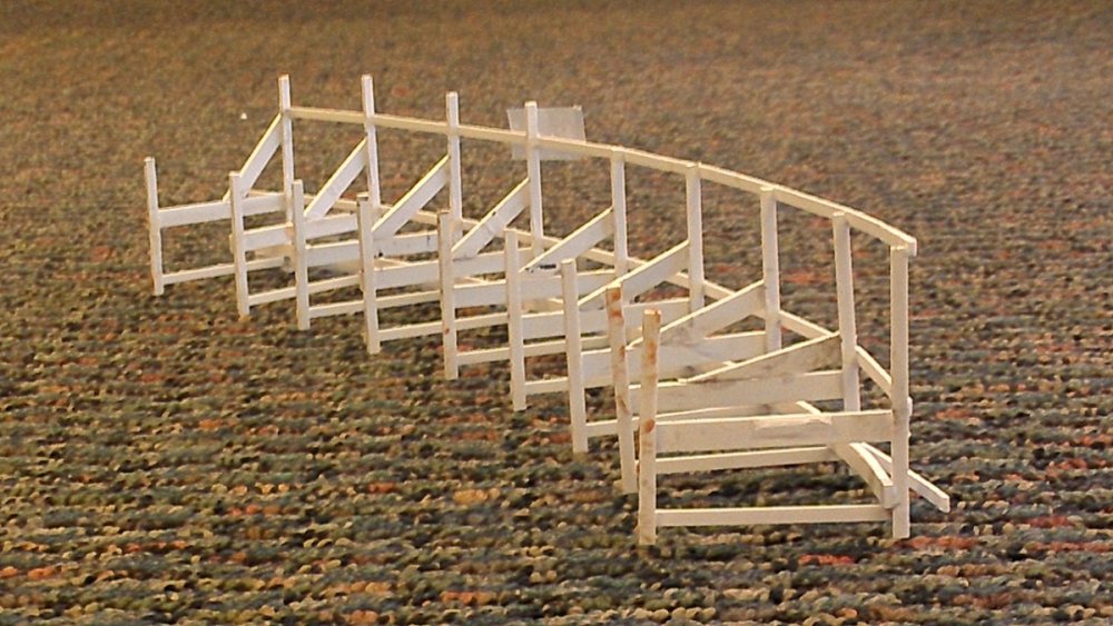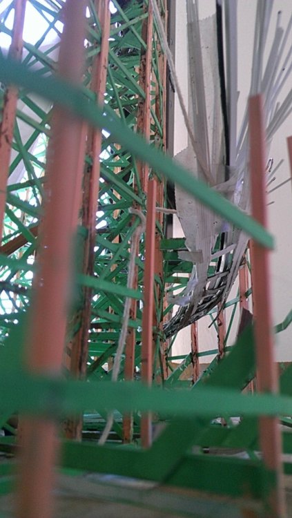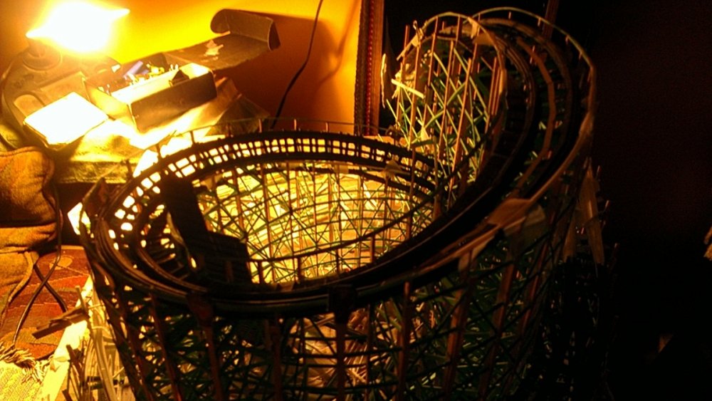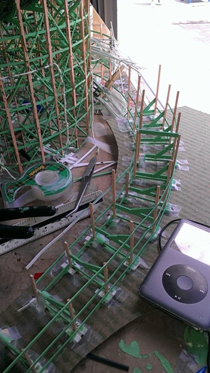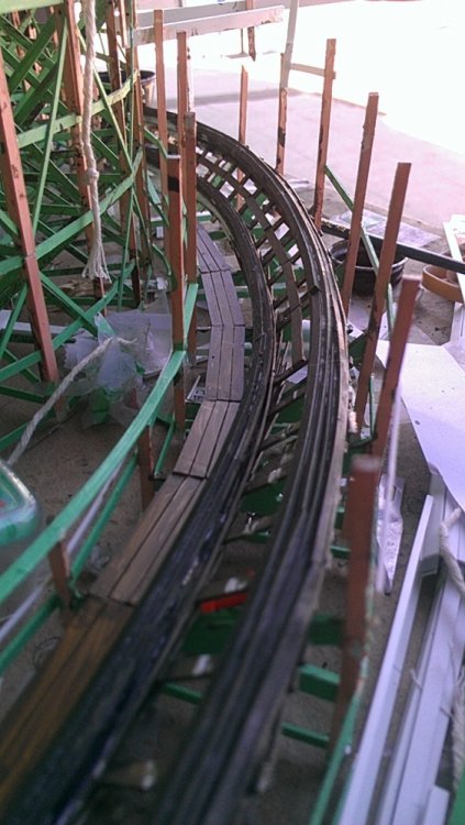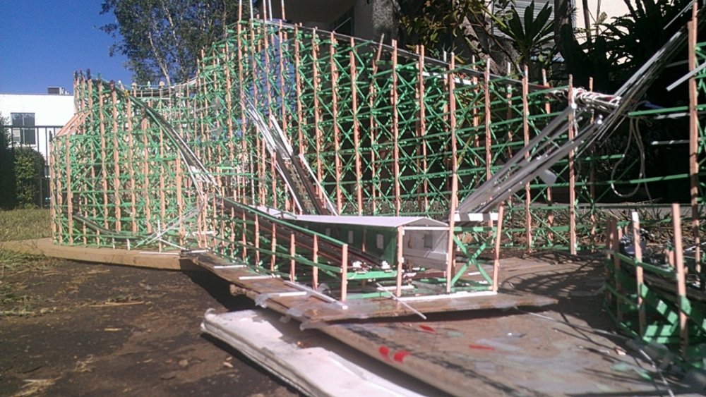 I am almost done with the spiral section of an abandoned Airplane coaster. Not quite done to be taking photos for an unveiling for it doesn't quite match the vision I had for a completed section. I decided last minute to build in the very wide circular pull out at the bottom of the spiral. Plus I discovered some reprofiling that had to be done. Maybe next weekend I will have something. In the mean time, here is a sneak peek. Whaddya think? Starting construction of the curved pull-out area from the 60' tall spiral. I'll add this to make the section look more complete. The abandoned Airplane coaster -