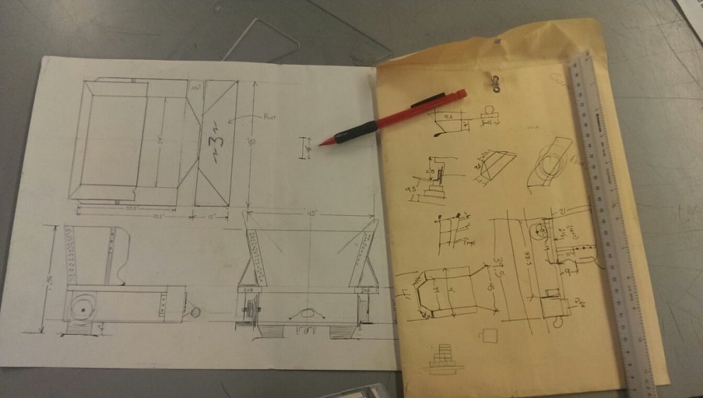 I went to Belmont Park to measure the original Bobs car on display in the ticket office/museum. The same style train operated on the Airplane, so I was lucky to have such a source close by. Here is the draft I came up with. The red pencil is pointing to the actual width of the car. -