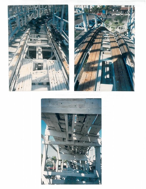 THE STATION HOUSE pt 1 The Giant Dipper on opening day 7/04/25. The coaster and the station were completely unpainted when opened. According to a review of the coaster's opening day, the article quotes, "Later on after the sea air has seasoned the wood the scaffolds will be give a fresh coat of white paint. Note the Victorian style roof. In 1955 almost exactly one year to the day after Jack Ray took over the Mission Beach Amusement Center lease, fate took an ugly turn once again. On Wednesday morning, February 2nd the roller coaster inexplicably caught fire. The blaze was discovered by former park leaseholder Roy Matheson, who at that time was still in charge of some of the rides and concessions. Destroyed was the coaster office, motor room, a set of coaster trains and some of the wooden framework. While firefighters were investigating the damage, they discovered the body of Walter T. Barney, 59, president of the Mission Beach Coaster Company. Barney operated the coaster since 1948. Firefighters believe the blaze started in the motor room where Barney must have been trapped while working. Reopening Day - May 31st, 1957 of the New Belmont Park. Jack Ray also was a carnival designer having created much of the 'circles and triangles' on ride facades and attractions at the Seattle Worlds Fair and around the world. At this point, the Giant Dipper sign was removed and the name eventually forgotten. It was renamed Earthquake in May of 1976. Note the motor house has a new design and was not painted yet when the coaster reopened. Showing the general state of disrepair of the station over its abandoned years. Volunteers from the California Conservation Corps tear apart the 50's style facade that covered up the original trusses under the roof. Later we realized much of this simple frame and plywood was used to simply cover up any evidence of the 1955 fire. The drop-ceiling was also installed in the 50's, probably to cover up both the visible burned areas and for structural reasons. You can see the black ceiling up towards the front of the newly constructed duplication of the original front.