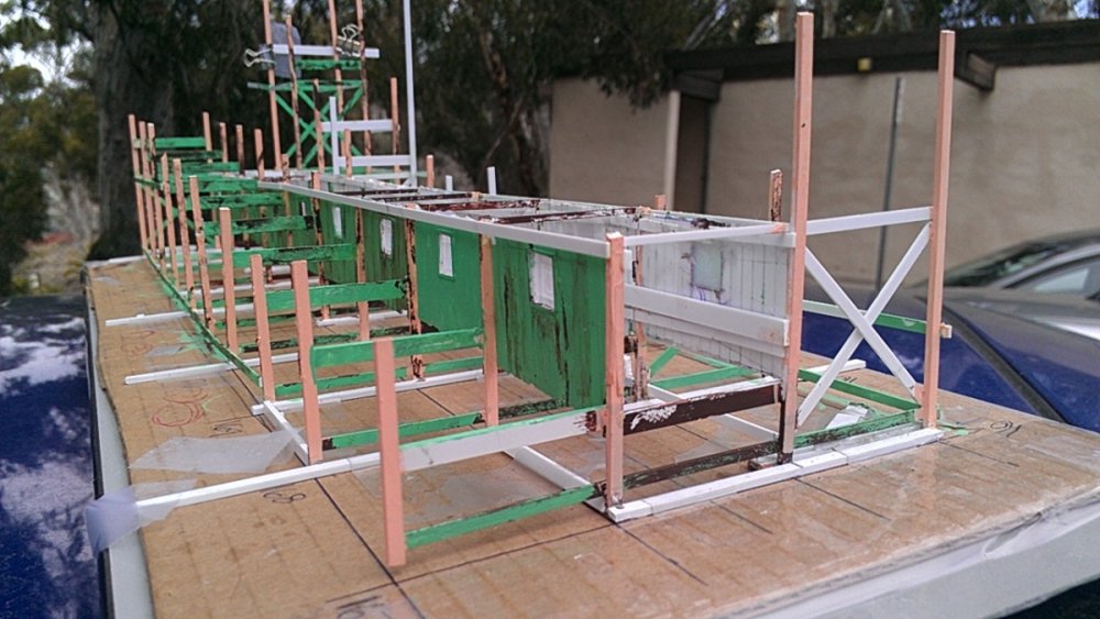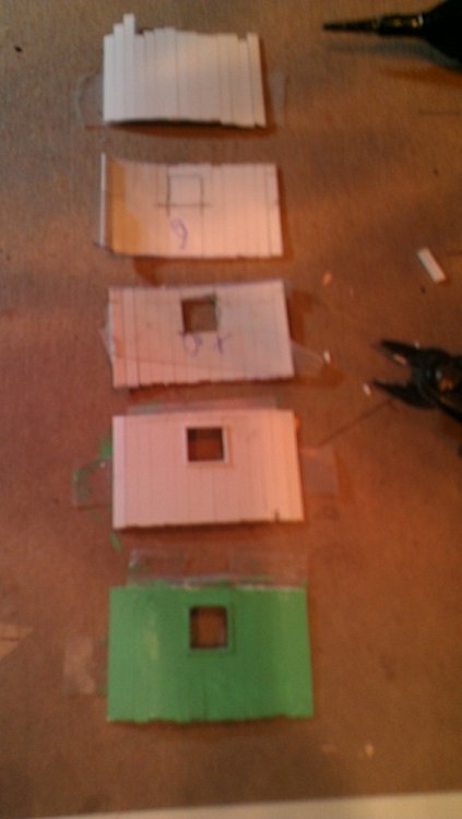 MAKING THE GARAGE When I don't feel like or can't work on the larger sections, I work on smaller projects, like pre-cutting, painting and other light work. In this case, I've been working on the garage that sits between the final brake run and the the middle of the ride. So, here is my process for making the garage walls. I snip plastic strips (2x8s) I line the chopped pieces up inside of a right angle. As hard as I can, I push the slats all together to eliminate any gaps between the boards. I secure with tape. The plastic strip I'm holding down with my index finger is to keep the slats from buckling up with I'm pushing. Then I trim, line out the window, cut out the window, put trim around the window and paint. Insert walls into frame. Add window panels. Add more finishing trim from front to back Looking down the garage. You know, this would be a GREAT place to store batteries if I ever want to light this up. -