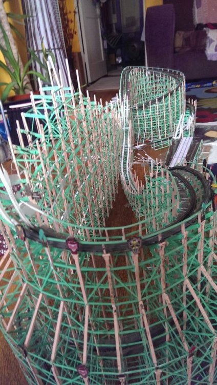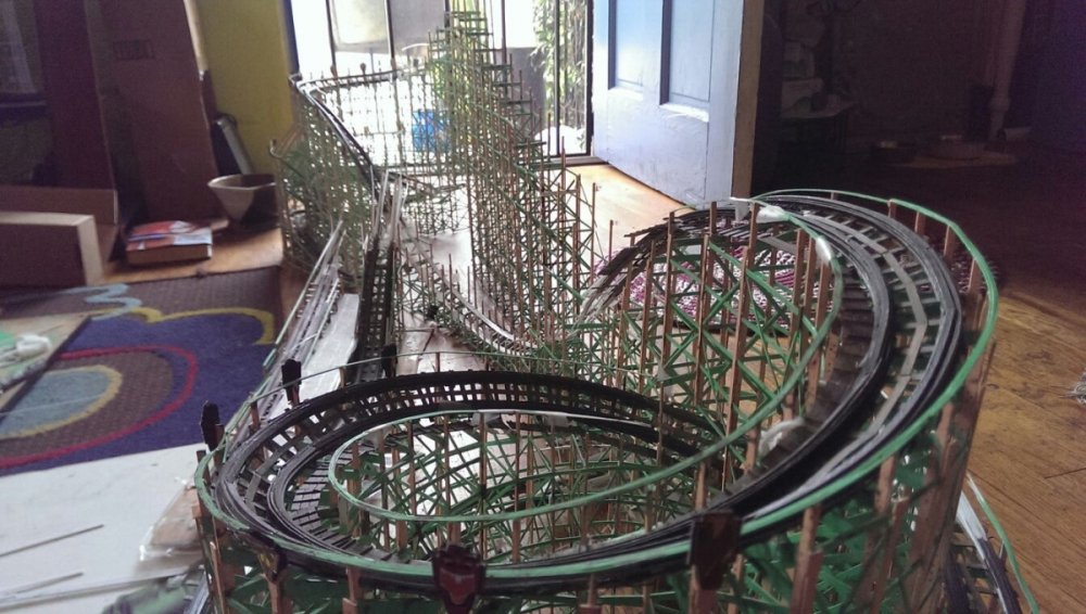 Just completed the frame for what I call, the slingshot. This is the where the coaster train careens out of the first spiral and shoots towards the next. -