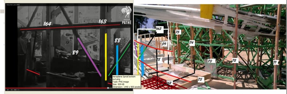 Update - The pullout area of the spiral (white) is confusing me in terms of exactly how high the track is off the ground. This new b&W frame capture arrived just in time to show me that I have to go back and do a little re-profiling here. Match the colored sticks for a reference. The brown grid would be the station floor. -