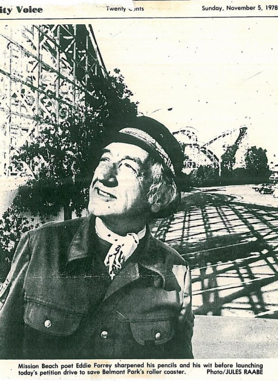 For the rest of the summer of ’79 I visited the property a half a dozen times, mostly to get clarity on issues I was having in the early stages of drafting plans for the Earthquake model. Even though I was trespassing, not once was I ever questioned or busted by authorities. Maybe it was because I had become closer and more familiar with the roller coaster, for when I saw a headline in an August ’79 edition of the San Diego Union that read: Panel Approves Demolition of Roller Coaster, my heart sank. The one ray of hope I held on to was the article’s mention of some beach locals who wanted to restore the ride. “I just might have to look into that,” I thought. I saw a local news story on TV where a couple of two very young clowns climbed atop the 70’ tall ride with balloons and banners trying to attract attention for the cause of preserving the coaster. The news also showed grounded police officers coaxing them off the scaffolds and then citing them once they were down. What was supposed to be a press conference about a handful of beach locals fighting to preserve the coaster, turned into a story of heartless police taking two clowns into custody. I forgot exactly when I met Eddie Forrey, the leader of that press conference. He was an 86-year old self-proclaimed beach poet who lived across the street from Belmont Park. I knew nothing of a petition drive he started to save the coaster in 1978. He showed up at every city council meeting that had to do with the topic of demolishing the coaster and would rally for its preservation. He would show up at the meetings with his troupe in tow, defending the coaster’s right to exist by holding up signs and reading poems such as: “What callous people would vote to destroy The last monument to thrill and joy? The echo of screaming laughter of children we’ll no longer hear The end for the coaster, I feel, is near.” I remember being a little skeptical after I learned his group was made up of a few clowns, vagrants, hippies, bikers, and some tag-alongs, none of whom had any strong community influence. Regardless, I could already see myself immersed in such a restoration project. I wanted so much to believe that it could happen. The roller coaster already had two strikes against it - two pro demolition, each vote from the San Diego Regional Coastal Commission and the San Diego City Council. The next and final hearing was to be before the California Coastal Commission. This is where Evans would get the final granting of the permit at a hearing scheduled March of 1980. It was April 1st, 1980 when I thought someone was joking with me about the sudden turn of events that took place at that meeting. I felt like a pet of mine died when I saw this in the San Diego Union. Pamela Sue Whitner (1959 - 2004) a.k.a. Flutterby Baby the Clown. One of the two clowns who was arrested after having climbed on top of the coaster. Pamela entertained kids at many Save the Coaster Commitee fundraisers.