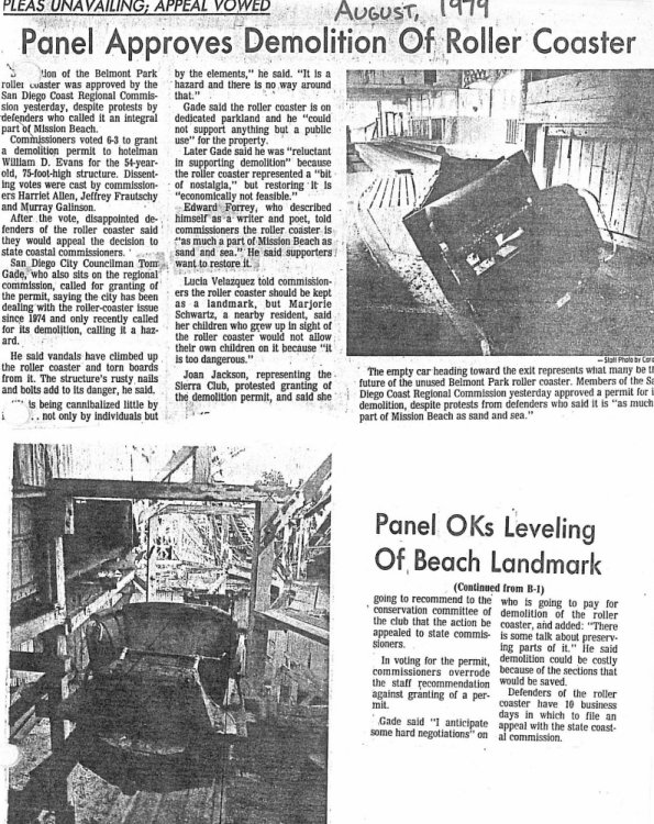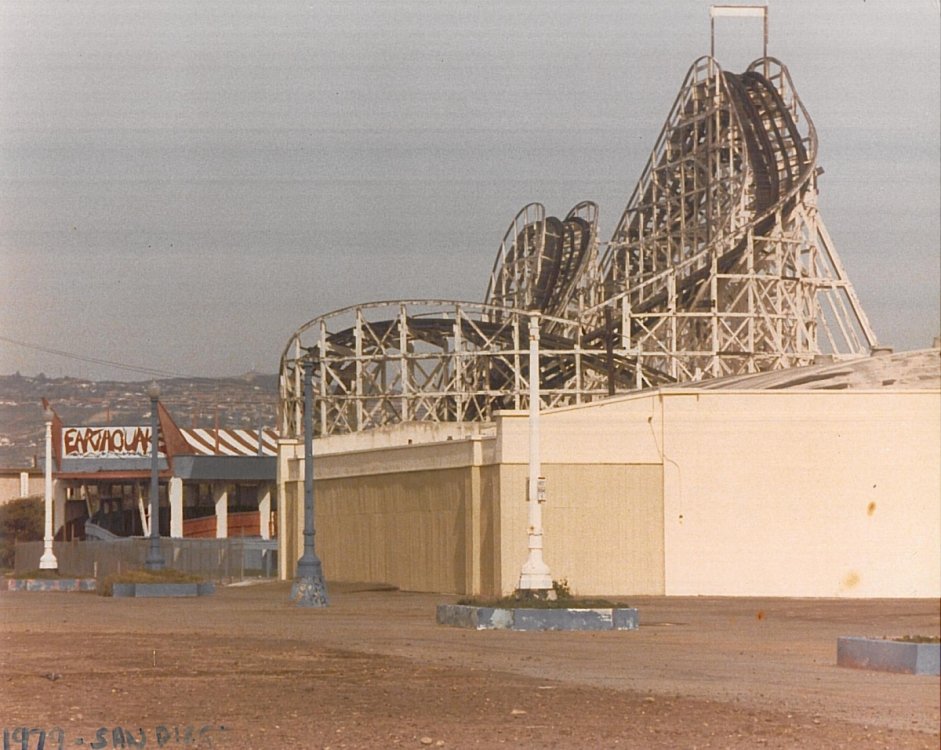 During the early part of 1979, the demise of the abandoned Earthquake roller coaster looked more certain with every passing news report. Around this time, I learned that the owner of the roller coaster was Hotelier Bill Evans, operator of Belmont Park since 1969. His abandoned roller coaster was sitting on city property and beach residents were actively working on having it removed. Belmont Park was the favorite playground for his two teens and he didn’t want to pay for the demolition if only for sentiment. Questions over who should have to pay for the demolition delayed the process. In the interest of keeping the bulldozers away, San Diego City Architect Consultant, Anthony Ciani, succeeded in having the Mission Beach Earthquake placed on the National Register of Historic Places in October of 1978. That designation happily hampered Evans' attempts to get a demolition permit as ordered because now there were extra legal hurdles to jump over. In frustration, the city went ahead and stapled “Intent to Demolish” notices to the coaster’s surrounding wood fence. They were going to simply rip down the coaster and charge it to Evans. Threatened with the possibility of losing federal funds by tearing down a recognized landmark, that motion was not passed by the San Diego City Council. I was taking a film class my senior year and my final project was a stop-motion ride on the Earthquake. My classmate, Howard Washburn, and I negotiated our way around the entire track, inches by inches, manually clicking the shutter on my new super 8mm movie camera. It took three afternoons. To this day, I think the resulting animation is impressive considering the circumstances. I got an A on the film and it was shown in part, on the local news! Barren Belmont Park in 1979. The old roller rink aka bumpercars aka Spoof Safari is in the foreground with the "Earthquake" roller coaster behind. Hard to believe the Earthquake would stand like this for 11 more years.