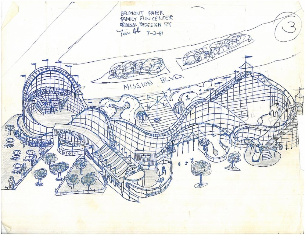 But I had this other vision in my head for a while and I thought it was a good time to draw it out and at least show it to somebody. My idea was using the space as a Family Fun Center type amusement park with a miniature golf course around and inside the Earthquake. Built up on the lower track paths would run go-karts that would use the station house for loading and unloading passengers. In the center of the north turn around I thought would be a fun place to have an activity jungle gym with rooms and tunnels inside the structure and two slides – one that goes down the first drop and a smaller one on the adjacent hill. I was only trying to introduce a concept I thought was being overlooked. I presented large painted versions of my design (below are the first drafts) before the Public Facilities and Recreation board on August 5, 1981. I knew nothing about city politics and was surprised at how casual everyone was in their behavior. It was a long meeting with the topic of redeveloping Belmont Park not starting until well over an hour later. My memory is a little fuzzy but I guess all three proposals were displayed and explained by the developer. My idea was using the space as a Family Fun Center type amusement park with a miniature golf course around and inside the Earthquake. Build up on the lower track paths would run go-karts that would use the station house for loading and unloading passengers. In the center of the north turn around I thought would be a fun place to have an activity jungle gym with rooms and tunnels inside the structure and two slides – one that goes down the first drop and a smaller one on the adjacent hill. Note: These drawings were done the exact same time the first mention of what is now called AIDS started making the news.