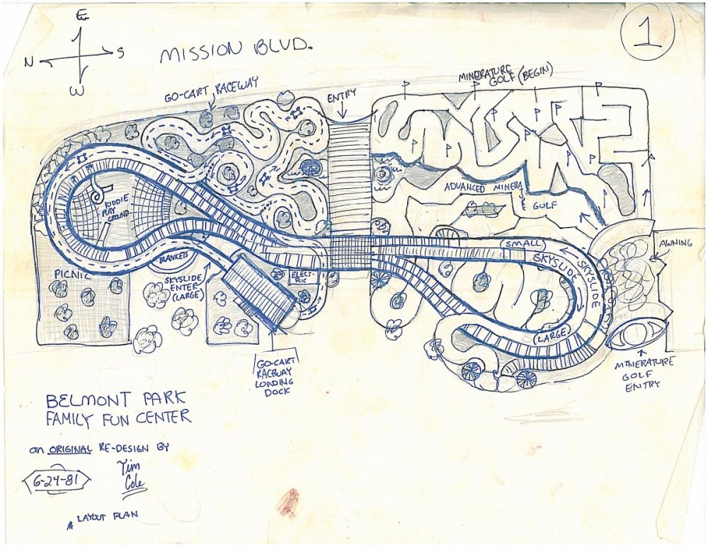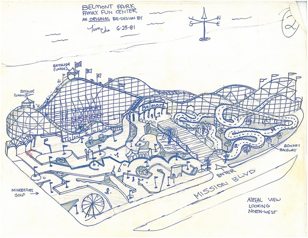 The Day That Changed My Life The Public Facilities and Recreation Board voted on a continuance of the matter, scheduled on the docket for October 7th, 1981. I forgot why I didn’t make a bee-line towards Carol when the meeting was over. I was probably more interested in press coverage out in the hallway. I was asked by a radio reporter about why the beach park meant so much for me to go through the trouble of designing and presenting my idea. Caught unprepared, whatever I said, I remember he lost interest right away. The night prior to the October meeting, I once again climbed up the Giant Dipper’s lift hill and raised about 4 or 5 flags made from my Mom’s old curtains. With red and black magic marker, I wrote clever sayings that could barely be read on these tiny curtains 70’ up in the air. “We love our old Rollie”, “One Mission Beach, one coaster, please…” are a couple I remember. I’ll post pictures later if I can find them. (I FOUND THEM -SEE BELOW) I was not prepared for how the last meeting ended with all three proposals being rejected so I wasn’t sure what to expect at this one. The topic of Mission Beach Roller Coaster came up about an hour into the program. Carol Lindemulder once again took center stage. "The Save the Coaster Committee Inc. will be formed for the exclusive purpose of restoring the Giant Dipper roller coaster back to its original condition. Added will be a roller coaster museum focusing primarily on the history of the Giant Dipper while touching on the history of seaside roller coasters and their general role in the development of surrounding beach communities. Admission and donations collected in the museum would help with maintenance costs of the restored coaster." A board of directors was coming together and important-sounding contacts had been made. I was all ears throughout the entire 10 minutes of her presentation and hung on every single word. Impressed that there was a group of known names in both the political and historical aspects of the proposed project, the PF&R board voted to allow Carol 90 more days to establish a true committee. Obtaining ownership of the roller coaster, insurance, non-profit status, completing a fund-raising and rehabilitation schedule, and having the integrity of the structure analyzed were amongst the many tasks to be completed within that time. Obtaining ownership of the coaster?? What's this??? At the end of that meeting I raced up to Carol and hastily introduced myself, and asked what can I do to help? She invited me to a board meeting sometime that month and gave me her card for Call Carol Interiors. My life changed on that day. The first building completed was the Roller Rink. It opened its doors to the public at 2pm March 7th, 1925 - nearly three months before the rest of the center. Constructed by contractors and builders Trepte and Son of San Diego, the tile and stucco structure was 90’x150’ with a Spanish influence in design and a skating surface of carefully selected maple. After serving 40 years as a roller rink, it became a bumper car pavilion (1966) The midway barren. After moving the bumper cars to another location in the park, the roller rink became a "Spoof Safari". Electric cars took passengers through a haunted house type of attraction. The building was boarded up in 1977 right after the park closed. (1984) It was a home for the world's population of pigeons. I took this that weekend before it was torn down in March of 1987. My painted version of my idea for a Belmont Fun Center presented before the Public Facilities and Recreation Board in 8/81 The night before the 8/5/81 meeting, I hung up flags made from Mom's old curtains, after she used them to make a dress..lol
