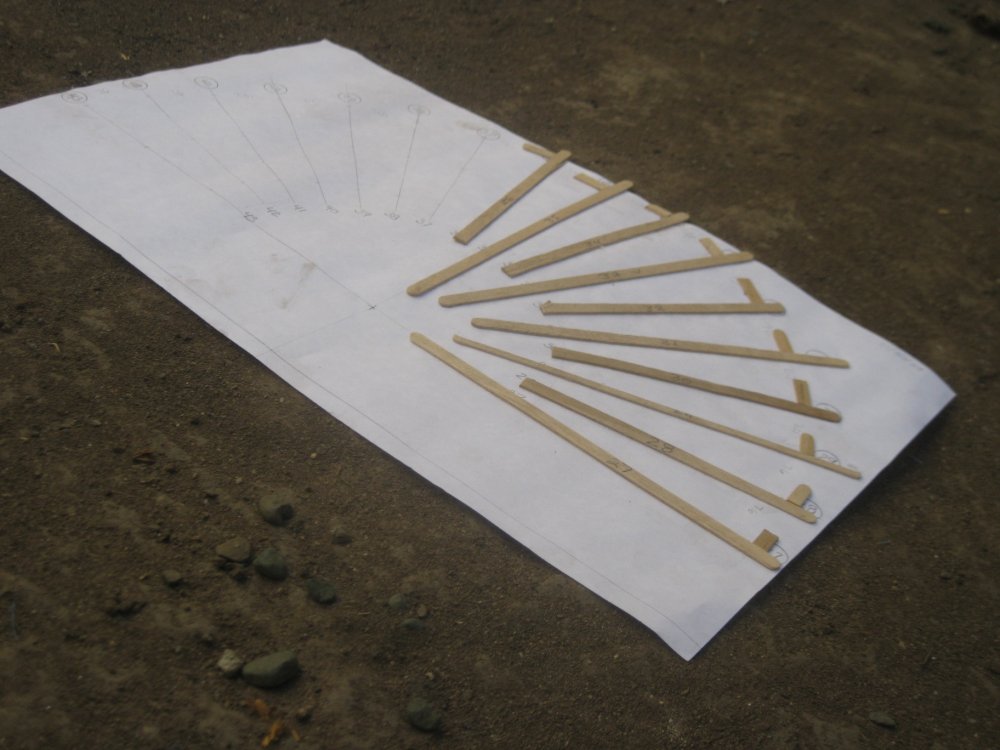 On 8/26/2012 at 4:20pm, the first bent begins to take shape. Interestingly enough, Bent 27 is banked 27 degrees at the top. One of uprights was exactly 14" tall (same as what the strips come in) so it didn't need any cutting! -