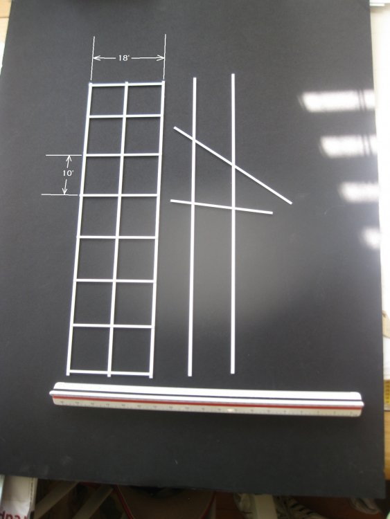 The following series of photos shows step by step, the initial process of constructing a scale model of the Airplane. The plans for the layout are done as are the lateral elevation drawings. I'm still working on the bent-by-bent elevation drawings - I should be done with those between a month or two. An older mock up of "anycoaster USA" to test use of styrene plastic as a medium. When I build this, I planned using the scale 3/16 = 1' with 6" x 8" uprights. Since, I've learned the taller uprights are 4" x 8" and the shorter ones 4" x 6" and my scale has enlarged slightly, now at 1" = 5'. -