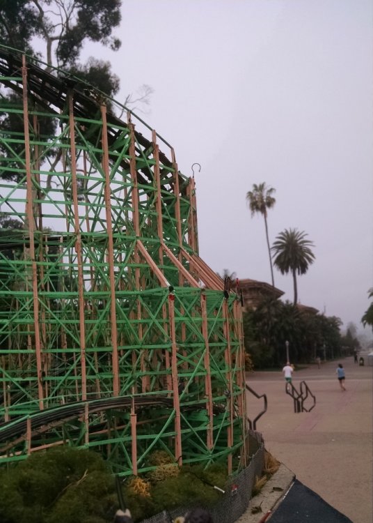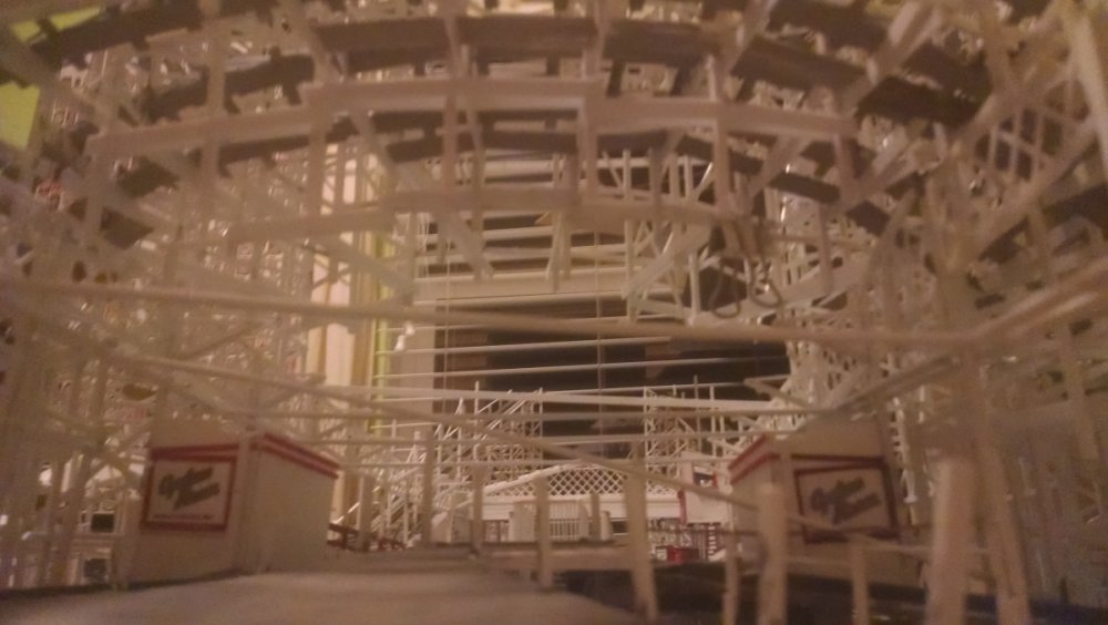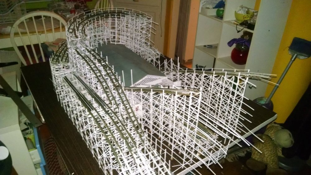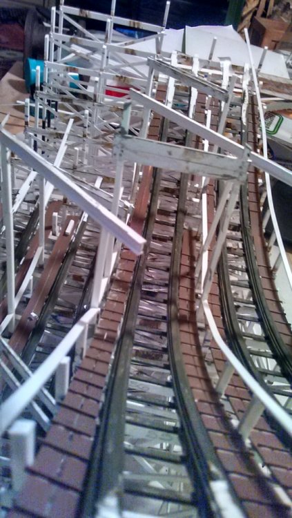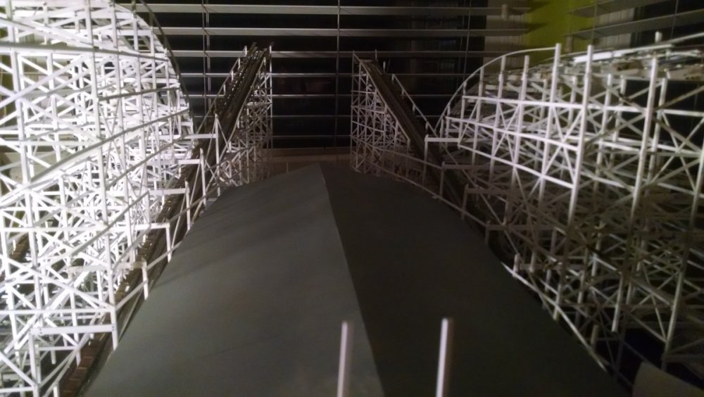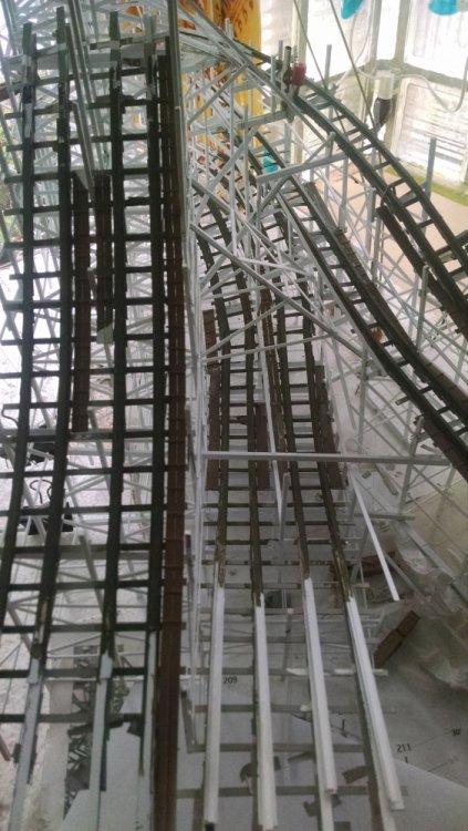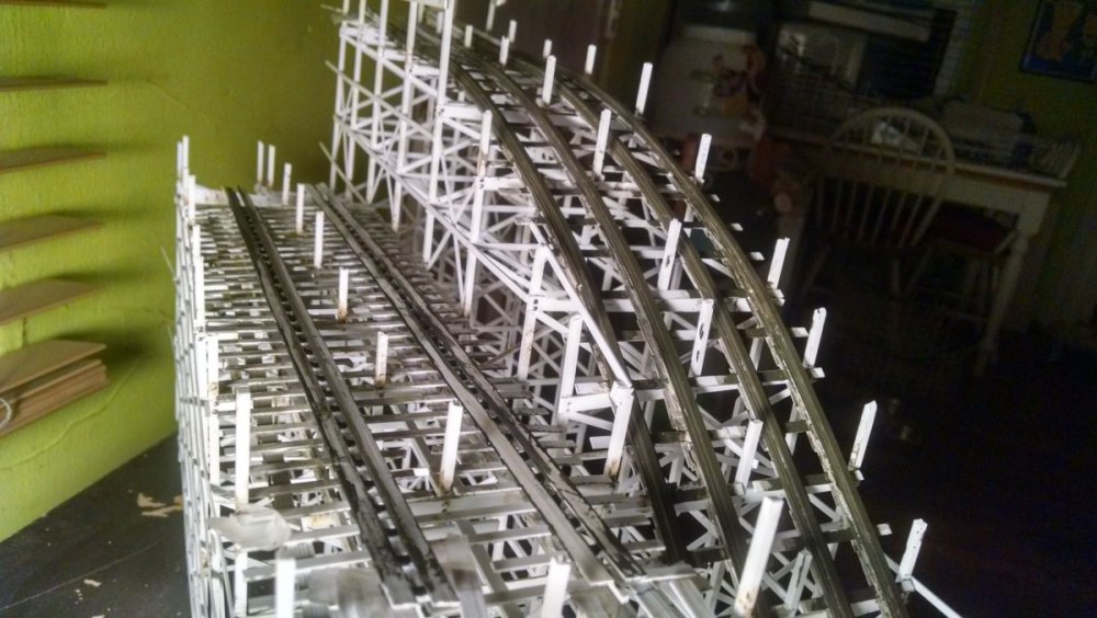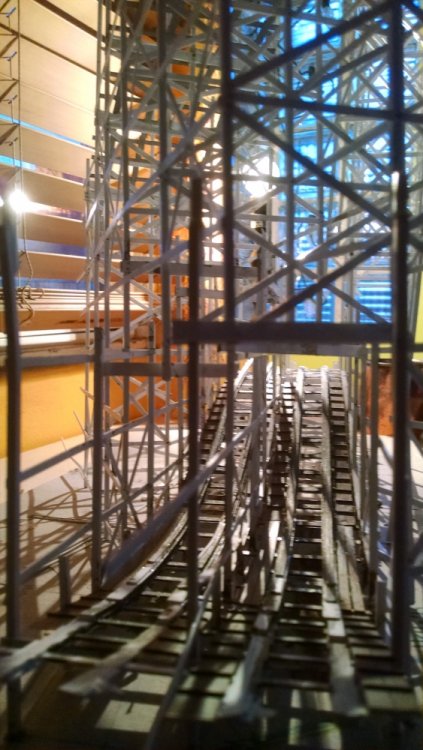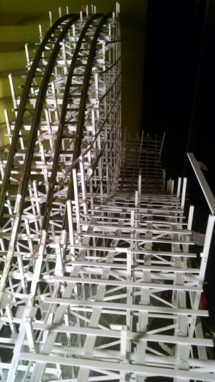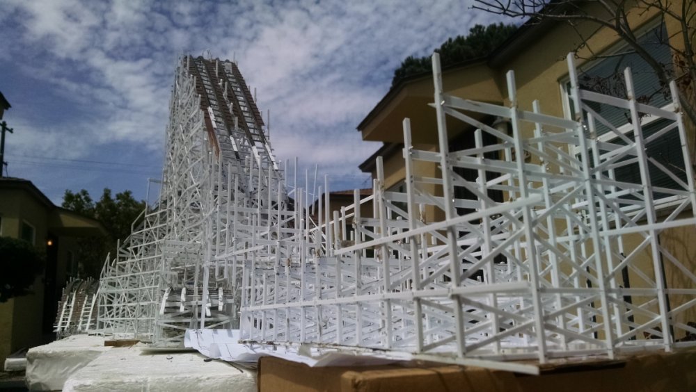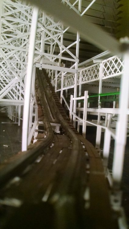 LONG OVERDUE UPDATE SOON Then I built the next layer of structure above – that hill in the middle of the ride that zig zags under the left hills. And I took that part and did a test fit over the low part. Sub track made and ready to lay! Beautiful fit. More lift hill bents. The tallest six bents have been built. And added. This is only the East lift hill. 6 duplicate bents are built, not shown. This picture is proof, that even on areas that are in the deepest bowels within the wood structure, I spared no attention to detail, even laminating the mid-layer of track that nobody will ever see. Also while on vacation, I created a little more space in my work corner along with some rearranging of my living room. The unexpected outcome was a nice roller coaster shadow on my wall! My handrails are notched around the lateral cross braces. Again, only people seeing this photo will see this deep in the ride. Track layers creeping up into the final brake section I set everything where it should set and added the supporting headers. To double check my accuracy, I took this shot to get an initial comparison to the real one. Until after I post this, I haven’t done that comparison. Note that the stacks of structure are not connected and still come apart in three pieces, accounting for some sticks that look like they're leaning. -