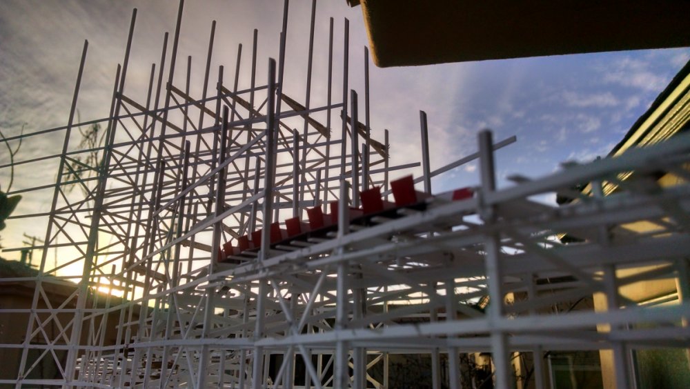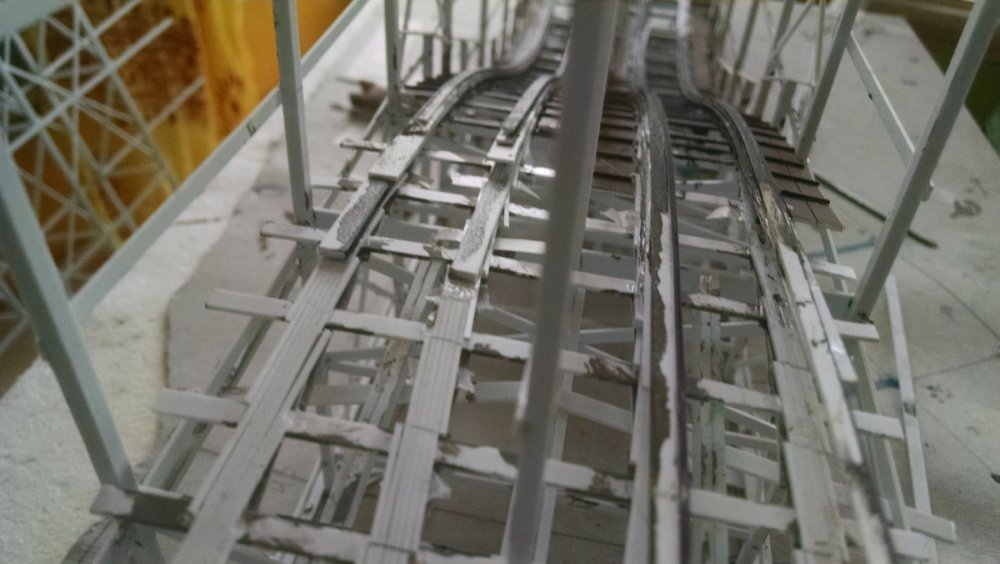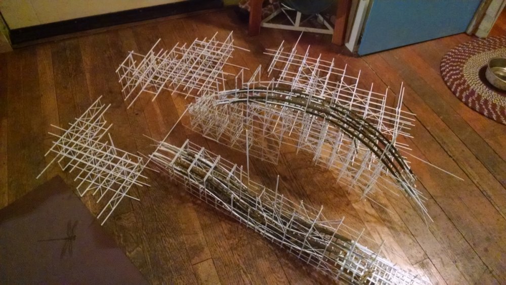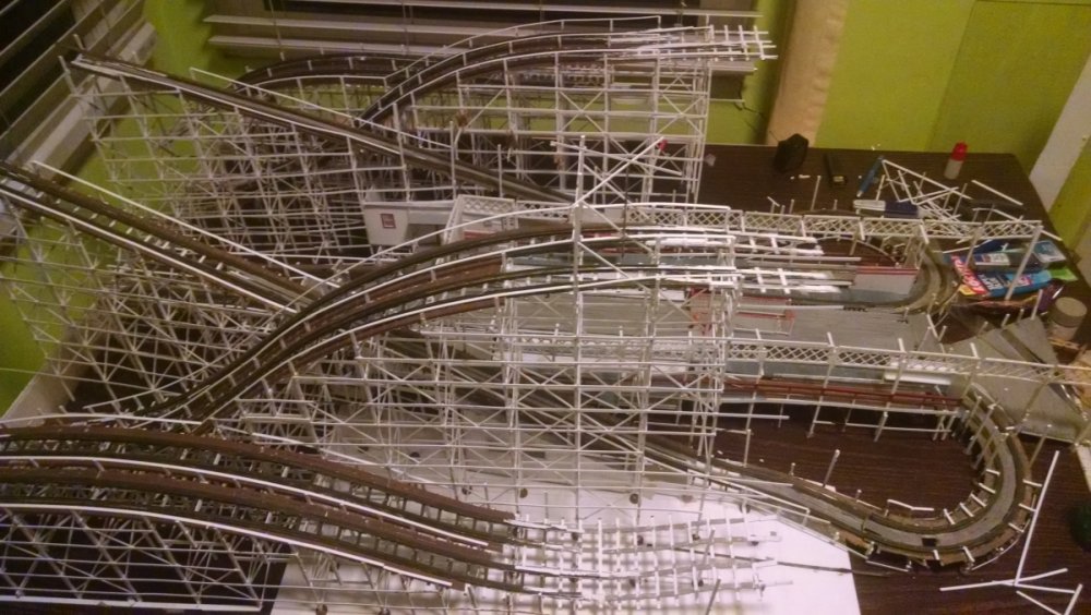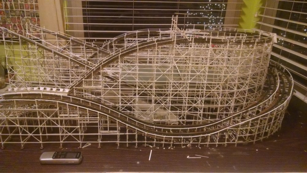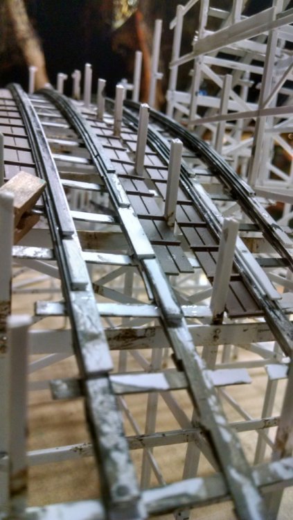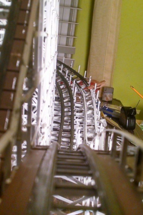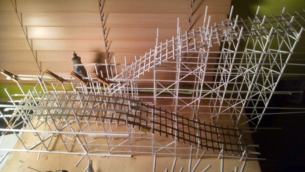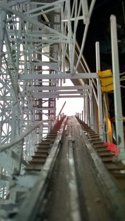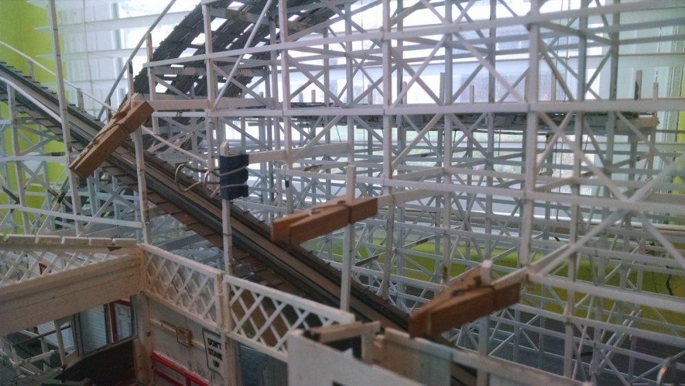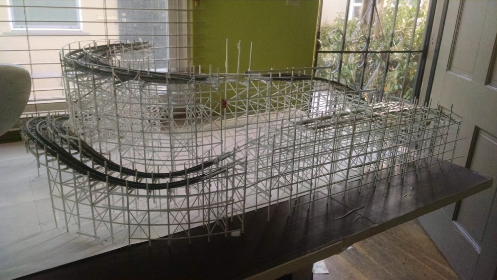 LONG OVERDUE UPDATE SOON Then I built the next layer of structure above – that hill in the middle of the ride that zig zags under the left hills. And I took that part and did a test fit over the low part. Sub track made and ready to lay! Beautiful fit. More lift hill bents. The tallest six bents have been built. And added. This is only the East lift hill. 6 duplicate bents are built, not shown. This picture is proof, that even on areas that are in the deepest bowels within the wood structure, I spared no attention to detail, even laminating the mid-layer of track that nobody will ever see. Also while on vacation, I created a little more space in my work corner along with some rearranging of my living room. The unexpected outcome was a nice roller coaster shadow on my wall! My handrails are notched around the lateral cross braces. Again, only people seeing this photo will see this deep in the ride. Track layers creeping up into the final brake section I set everything where it should set and added the supporting headers. To double check my accuracy, I took this shot to get an initial comparison to the real one. Until after I post this, I haven’t done that comparison. Note that the stacks of structure are not connected and still come apart in three pieces, accounting for some sticks that look like they're leaning. -