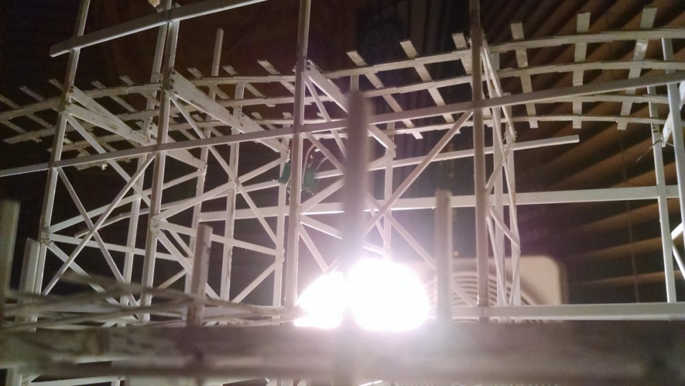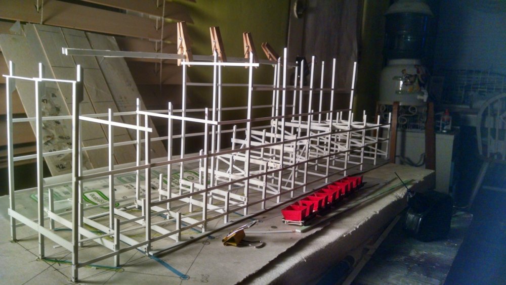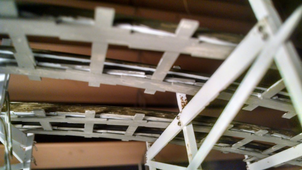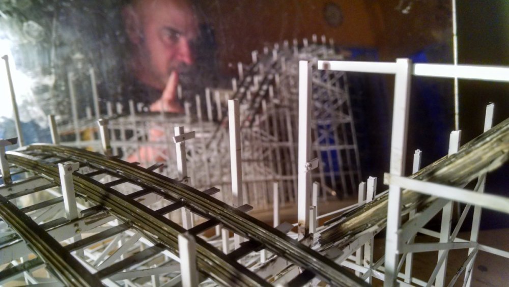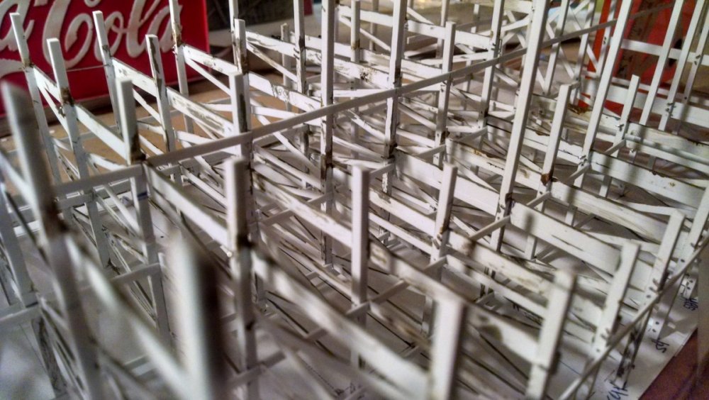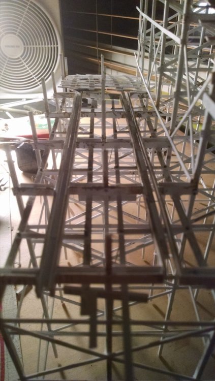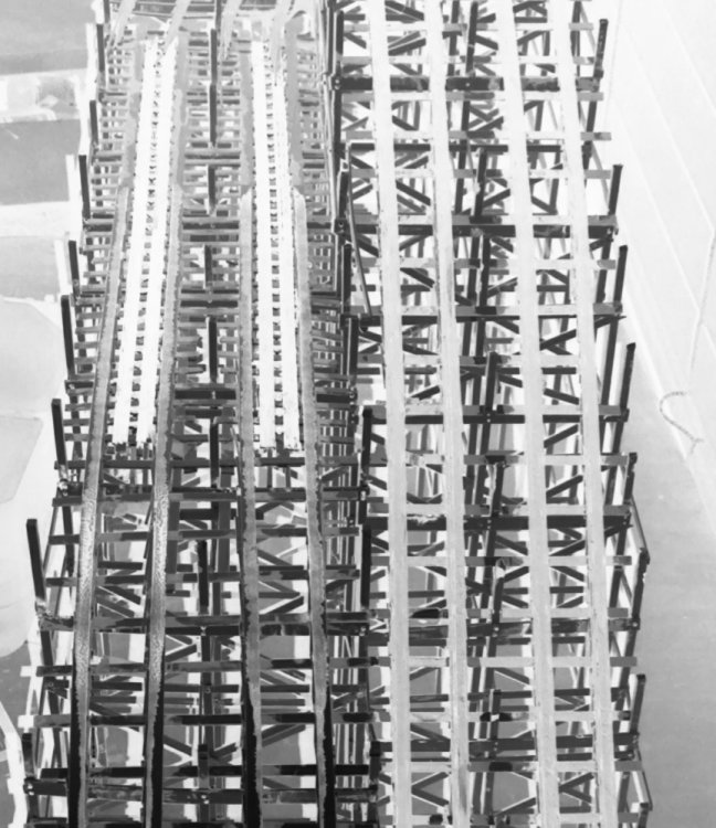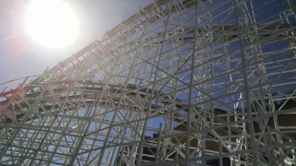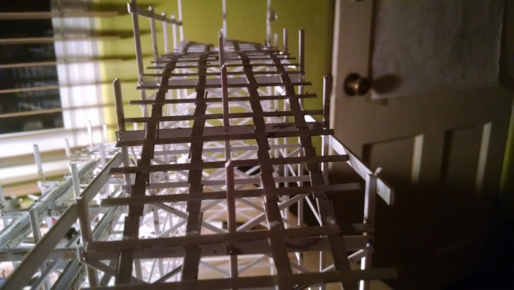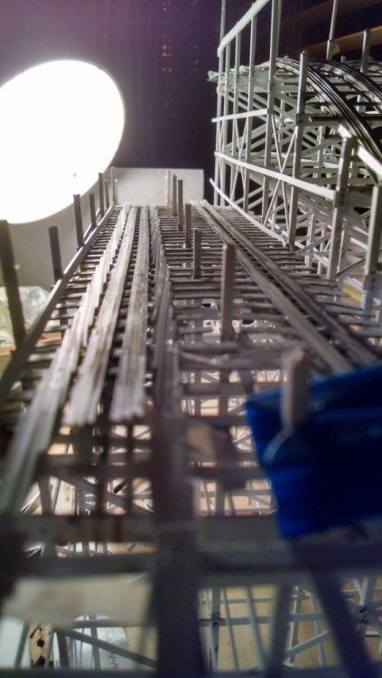 LONG OVERDUE UPDATE SOON Then I built the next layer of structure above – that hill in the middle of the ride that zig zags under the left hills. And I took that part and did a test fit over the low part. Sub track made and ready to lay! Beautiful fit. More lift hill bents. The tallest six bents have been built. And added. This is only the East lift hill. 6 duplicate bents are built, not shown. This picture is proof, that even on areas that are in the deepest bowels within the wood structure, I spared no attention to detail, even laminating the mid-layer of track that nobody will ever see. Also while on vacation, I created a little more space in my work corner along with some rearranging of my living room. The unexpected outcome was a nice roller coaster shadow on my wall! My handrails are notched around the lateral cross braces. Again, only people seeing this photo will see this deep in the ride. Track layers creeping up into the final brake section I set everything where it should set and added the supporting headers. To double check my accuracy, I took this shot to get an initial comparison to the real one. Until after I post this, I haven’t done that comparison. Note that the stacks of structure are not connected and still come apart in three pieces, accounting for some sticks that look like they're leaning. -