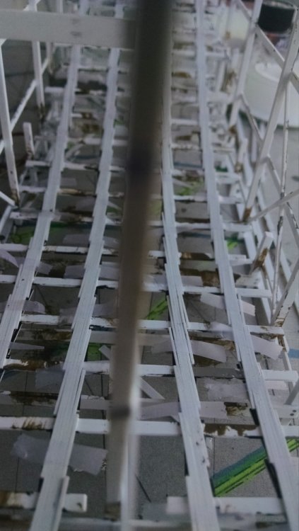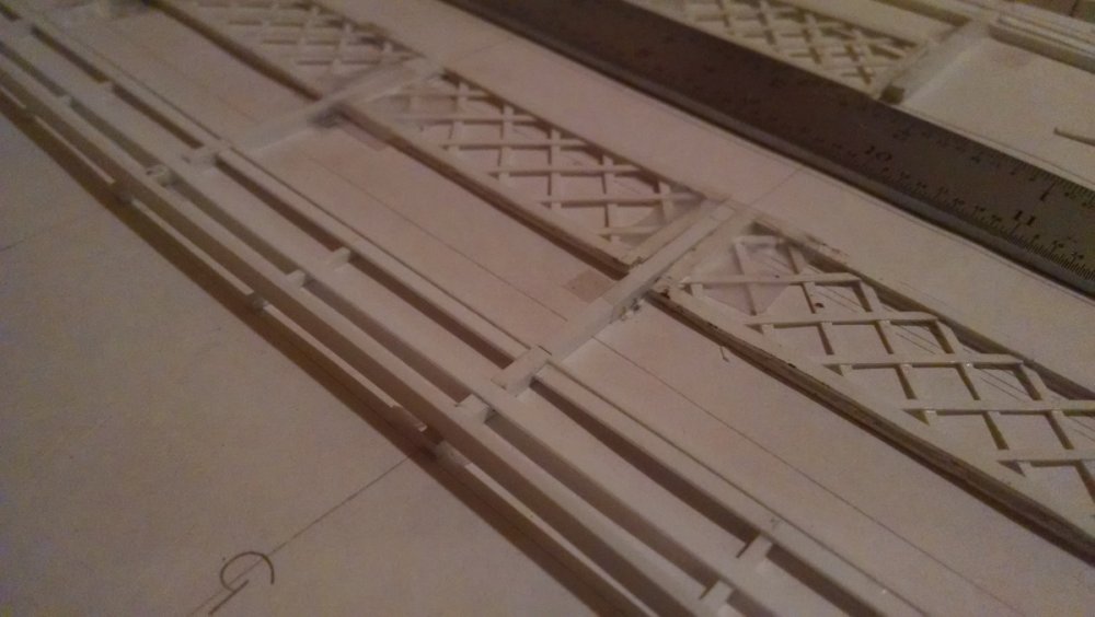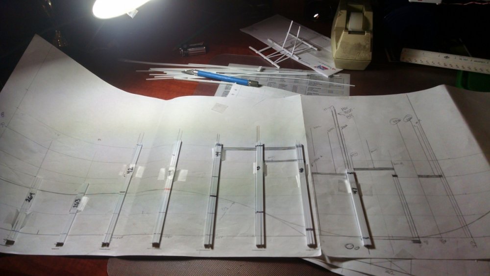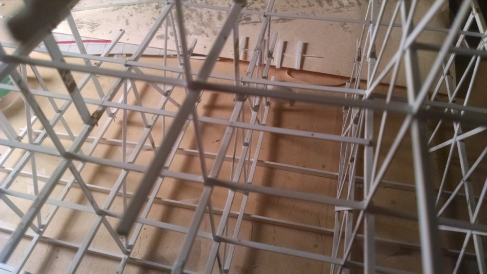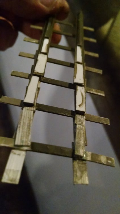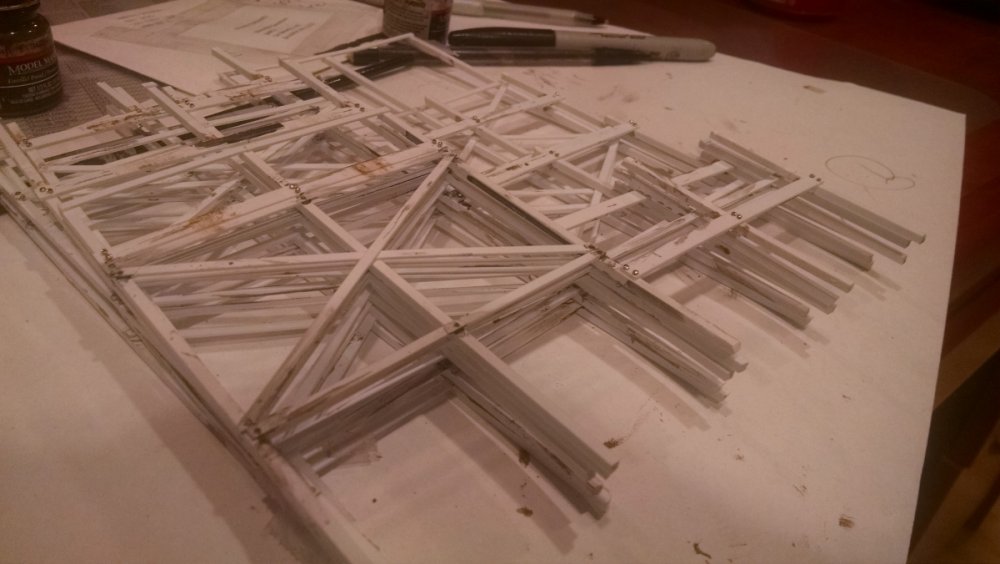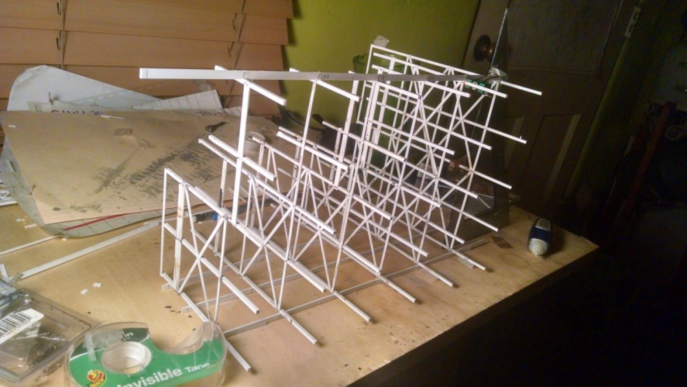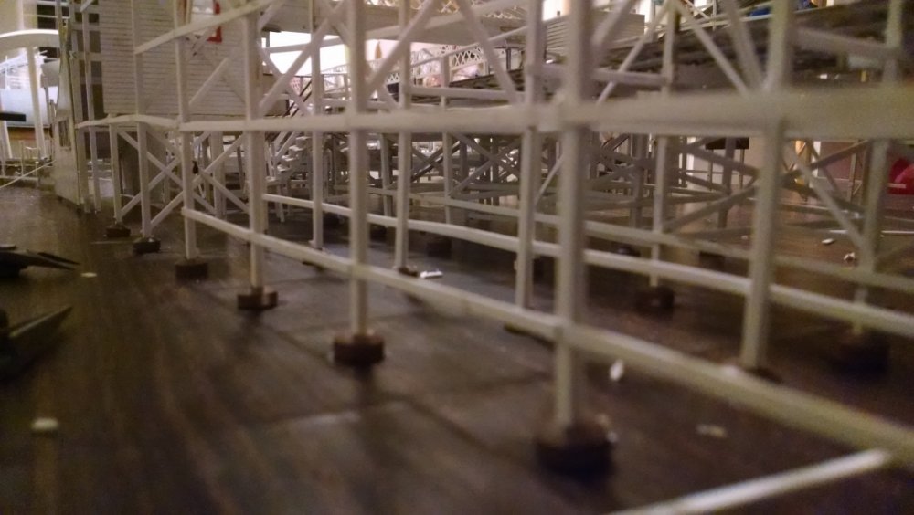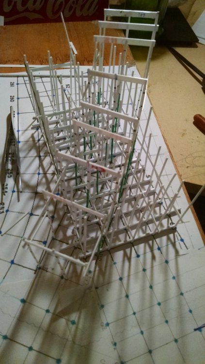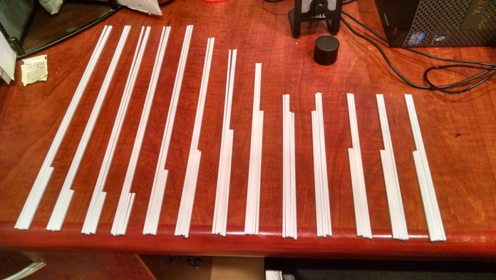 LONG OVERDUE UPDATE SOON Then I built the next layer of structure above – that hill in the middle of the ride that zig zags under the left hills. And I took that part and did a test fit over the low part. Sub track made and ready to lay! Beautiful fit. More lift hill bents. The tallest six bents have been built. And added. This is only the East lift hill. 6 duplicate bents are built, not shown. This picture is proof, that even on areas that are in the deepest bowels within the wood structure, I spared no attention to detail, even laminating the mid-layer of track that nobody will ever see. Also while on vacation, I created a little more space in my work corner along with some rearranging of my living room. The unexpected outcome was a nice roller coaster shadow on my wall! My handrails are notched around the lateral cross braces. Again, only people seeing this photo will see this deep in the ride. Track layers creeping up into the final brake section I set everything where it should set and added the supporting headers. To double check my accuracy, I took this shot to get an initial comparison to the real one. Until after I post this, I haven’t done that comparison. Note that the stacks of structure are not connected and still come apart in three pieces, accounting for some sticks that look like they're leaning. -