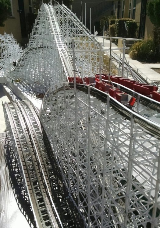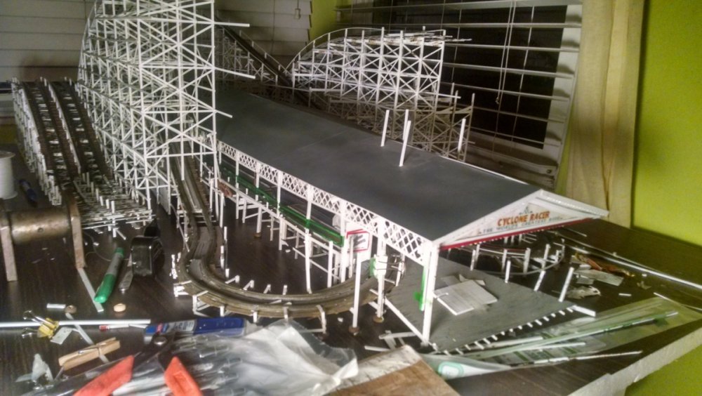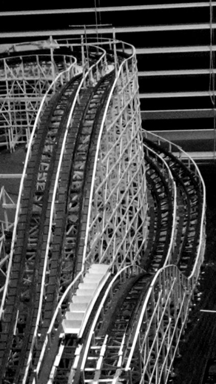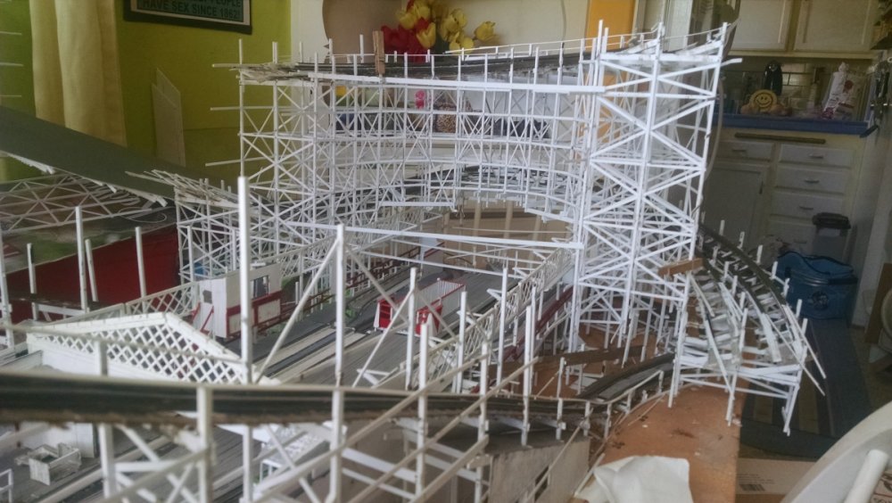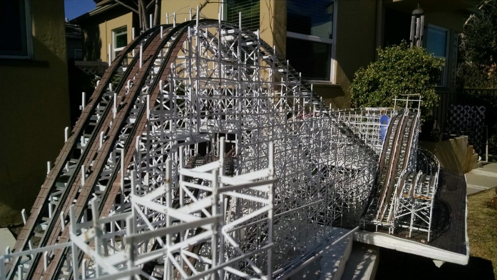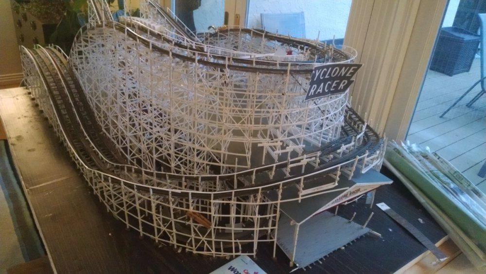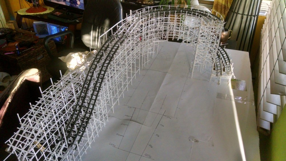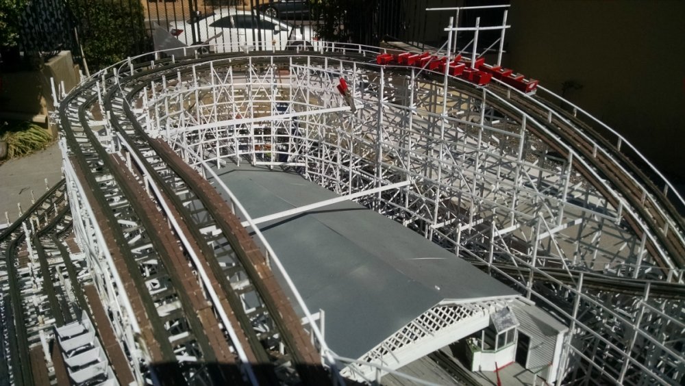Hi everyone, First of all I want to dedicate this post to my best friend, Dan Reed, who was crossing a clearly marked intersection and was hit and killed by an errant driver last January right after his 50th birthday. Ironically, while I'm really passionate and eager to educate people to the dangers of distracted driving, so goes the same for distracted walking. He was probably looking at his phone and stoned out of his gourd, the driver was still at fault. There hasn't been a post on here since then, I guess I was affected beyond what I thought. Well, below is an update on the building of the model Cyclone Racer. It's coming along fantastic and this may be enough photos to warrant two separate postings. R.I.P. my best friend Dan Reed whose photo sits on what was his favorite chair when he came to visit. Okay, on to the Cyclone Racer. Last we left, I had the main northern third including the station house, near completion. Here are the starts of the next main portion including the dip up into the brakes, part of the first drop, the nice round hill buried under the lift hills, two portions of that visible as well. Buuzzzzzz, tap tap tap, saw saw, hammer hammer. Almost looks like a real construction at first as it begins to piece together. The next part to figure out and build is the valley of the first drop where it dives under the valley of the second drop. LOTS of mixing it up in this area. So first thing I did was build a 1/2 scale (from the model scale) rough over the plan so I could get 3D visual so I could better figure out how the bents and headers were designed. Moving from mock-up to actual model, that area under the first drop is very heavy in terms of timber concentration! The rise up to the third hill is ready to install. But not yet. Lift hill tracks made for the crest over the lift and down the first drop. Slapped that track right on there. I stopped doing professional style drawings. Notes and sketches are all I really need. The next few are shots I took this weekend when Gary Kyriazi came to visit me. He wrote, "The Great American Amusement Parks" book in 1976. This book is responsible for dying the coaster fever into my wool. All the gaps are not filled in yet. Good night. Until next time. -