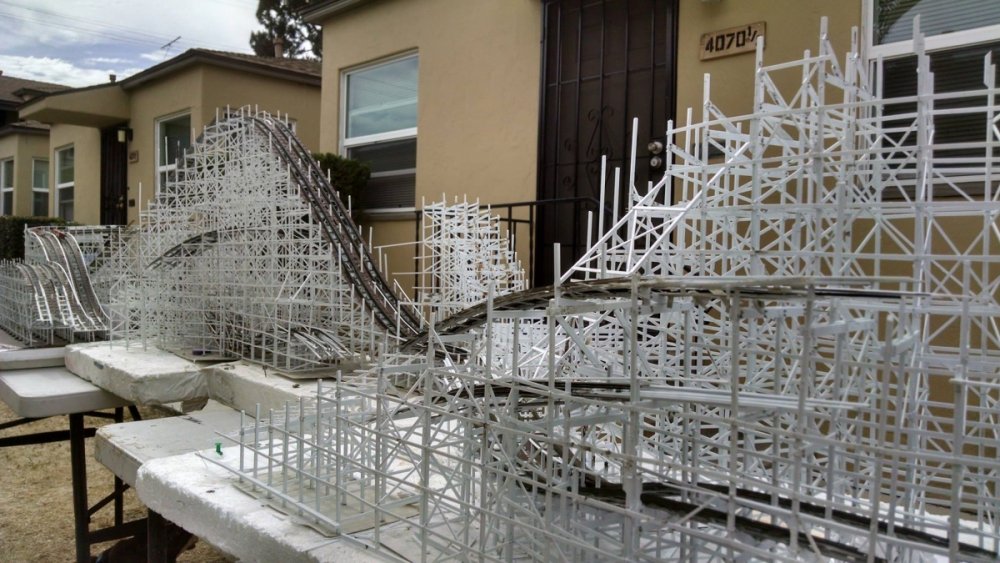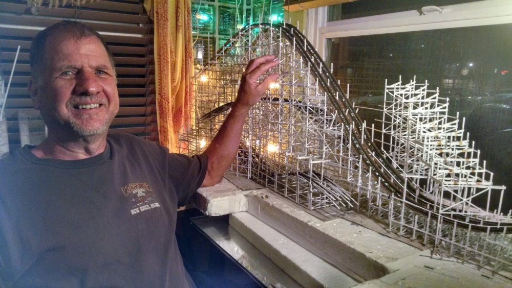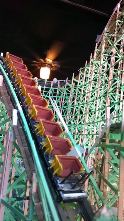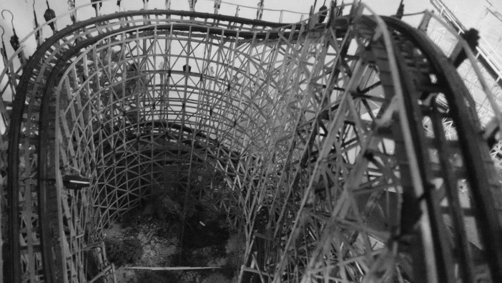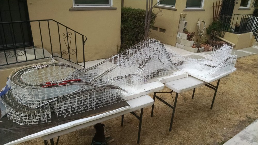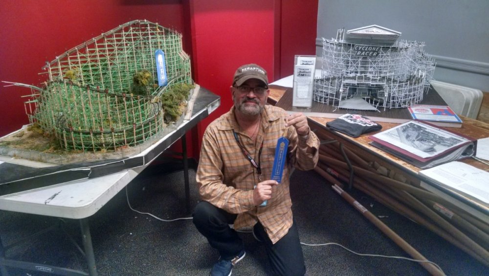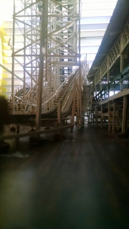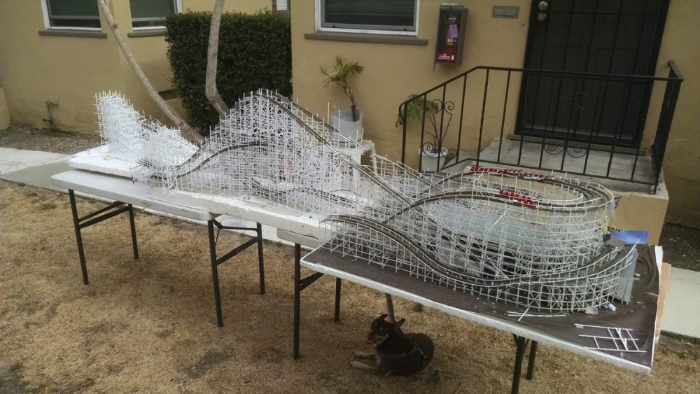 Hi everyone, First of all I want to dedicate this post to my best friend, Dan Reed, who was crossing a clearly marked intersection and was hit and killed by an errant driver last January right after his 50th birthday. Ironically, while I'm really passionate and eager to educate people to the dangers of distracted driving, so goes the same for distracted walking. He was probably looking at his phone and stoned out of his gourd, the driver was still at fault. There hasn't been a post on here since then, I guess I was affected beyond what I thought. Well, below is an update on the building of the model Cyclone Racer. It's coming along fantastic and this may be enough photos to warrant two separate postings. R.I.P. my best friend Dan Reed whose photo sits on what was his favorite chair when he came to visit. Okay, on to the Cyclone Racer. Last we left, I had the main northern third including the station house, near completion. Here are the starts of the next main portion including the dip up into the brakes, part of the first drop, the nice round hill buried under the lift hills, two portions of that visible as well. Buuzzzzzz, tap tap tap, saw saw, hammer hammer. Almost looks like a real construction at first as it begins to piece together. The next part to figure out and build is the valley of the first drop where it dives under the valley of the second drop. LOTS of mixing it up in this area. So first thing I did was build a 1/2 scale (from the model scale) rough over the plan so I could get 3D visual so I could better figure out how the bents and headers were designed. Moving from mock-up to actual model, that area under the first drop is very heavy in terms of timber concentration! The rise up to the third hill is ready to install. But not yet. Lift hill tracks made for the crest over the lift and down the first drop. Slapped that track right on there. I stopped doing professional style drawings. Notes and sketches are all I really need. The next few are shots I took this weekend when Gary Kyriazi came to visit me. He wrote, "The Great American Amusement Parks" book in 1976. This book is responsible for dying the coaster fever into my wool. All the gaps are not filled in yet. Good night. Until next time. -