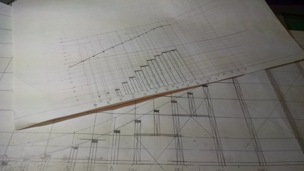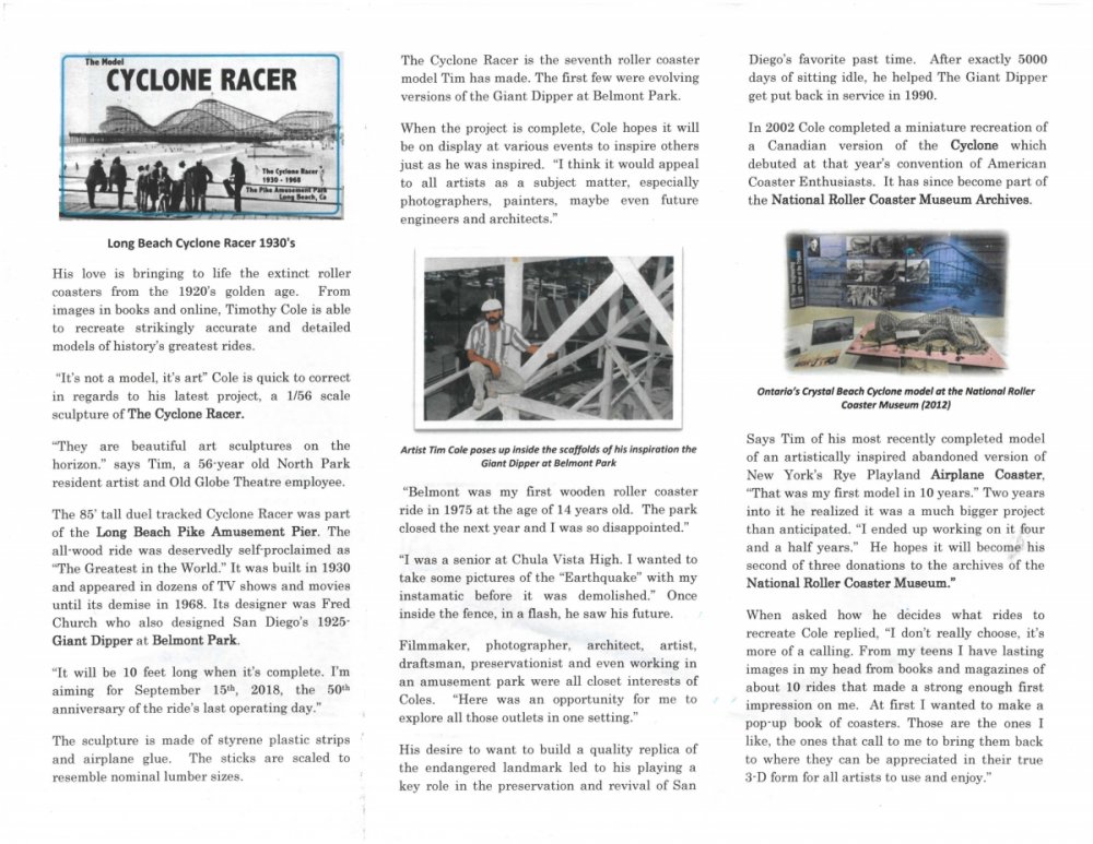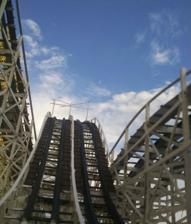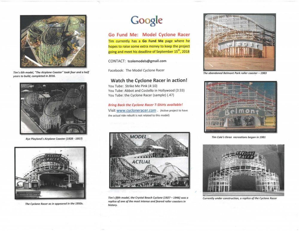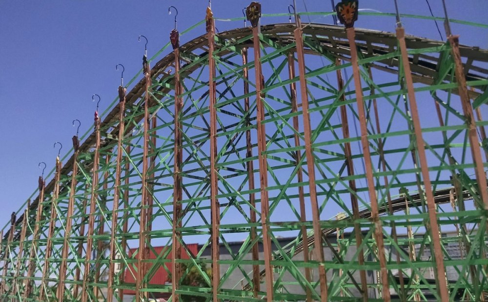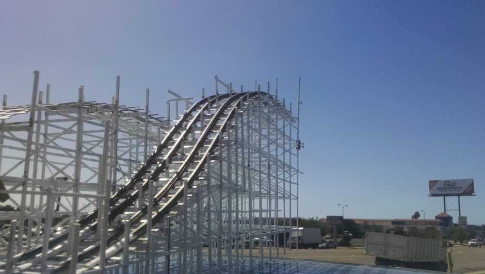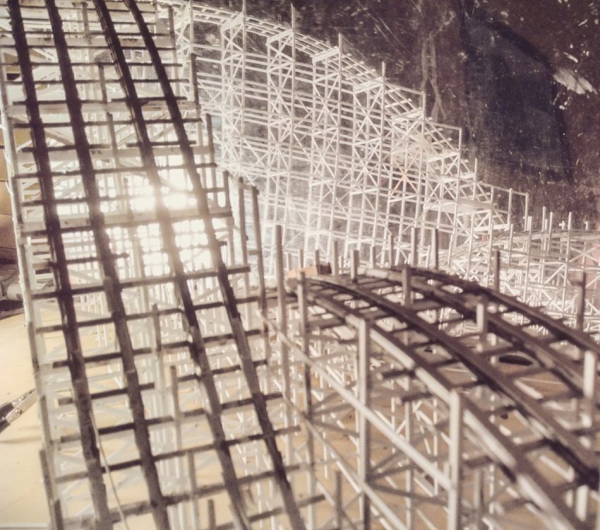 Hi everyone, First of all I want to dedicate this post to my best friend, Dan Reed, who was crossing a clearly marked intersection and was hit and killed by an errant driver last January right after his 50th birthday. Ironically, while I'm really passionate and eager to educate people to the dangers of distracted driving, so goes the same for distracted walking. He was probably looking at his phone and stoned out of his gourd, the driver was still at fault. There hasn't been a post on here since then, I guess I was affected beyond what I thought. Well, below is an update on the building of the model Cyclone Racer. It's coming along fantastic and this may be enough photos to warrant two separate postings. R.I.P. my best friend Dan Reed whose photo sits on what was his favorite chair when he came to visit. Okay, on to the Cyclone Racer. Last we left, I had the main northern third including the station house, near completion. Here are the starts of the next main portion including the dip up into the brakes, part of the first drop, the nice round hill buried under the lift hills, two portions of that visible as well. Buuzzzzzz, tap tap tap, saw saw, hammer hammer. Almost looks like a real construction at first as it begins to piece together. The next part to figure out and build is the valley of the first drop where it dives under the valley of the second drop. LOTS of mixing it up in this area. So first thing I did was build a 1/2 scale (from the model scale) rough over the plan so I could get 3D visual so I could better figure out how the bents and headers were designed. Moving from mock-up to actual model, that area under the first drop is very heavy in terms of timber concentration! The rise up to the third hill is ready to install. But not yet. Lift hill tracks made for the crest over the lift and down the first drop. Slapped that track right on there. I stopped doing professional style drawings. Notes and sketches are all I really need. The next few are shots I took this weekend when Gary Kyriazi came to visit me. He wrote, "The Great American Amusement Parks" book in 1976. This book is responsible for dying the coaster fever into my wool. All the gaps are not filled in yet. Good night. Until next time. -