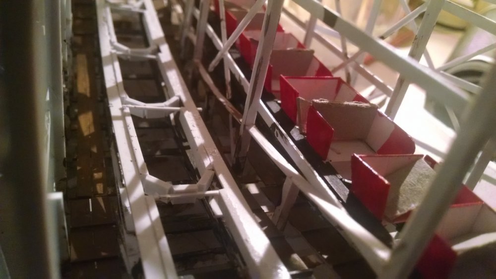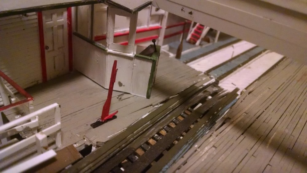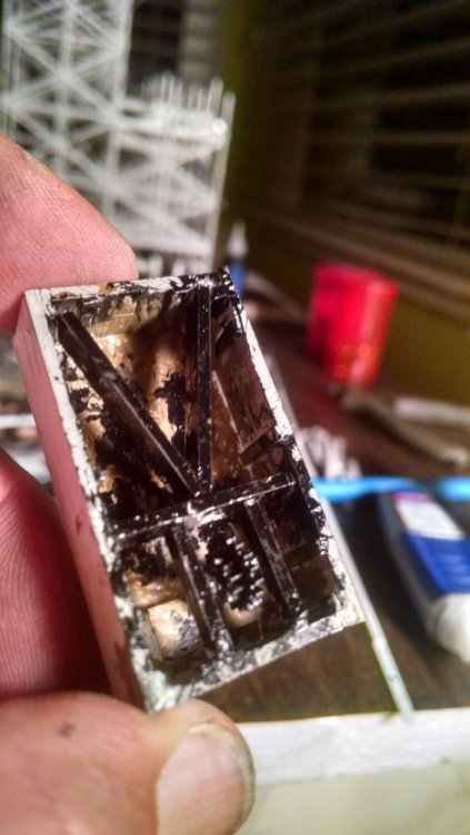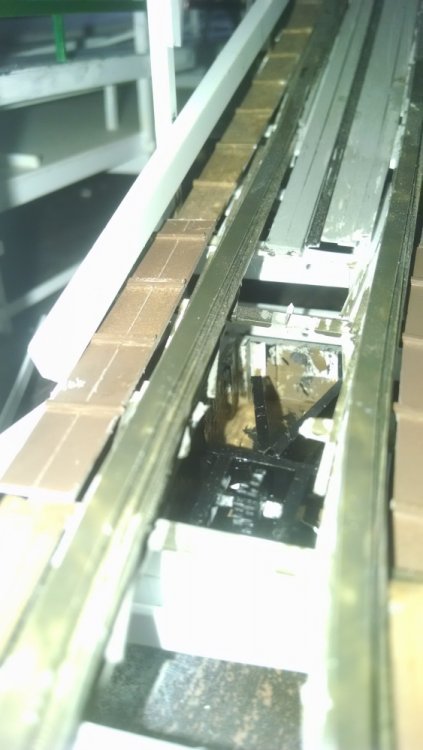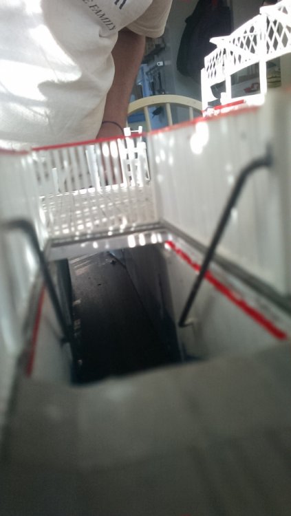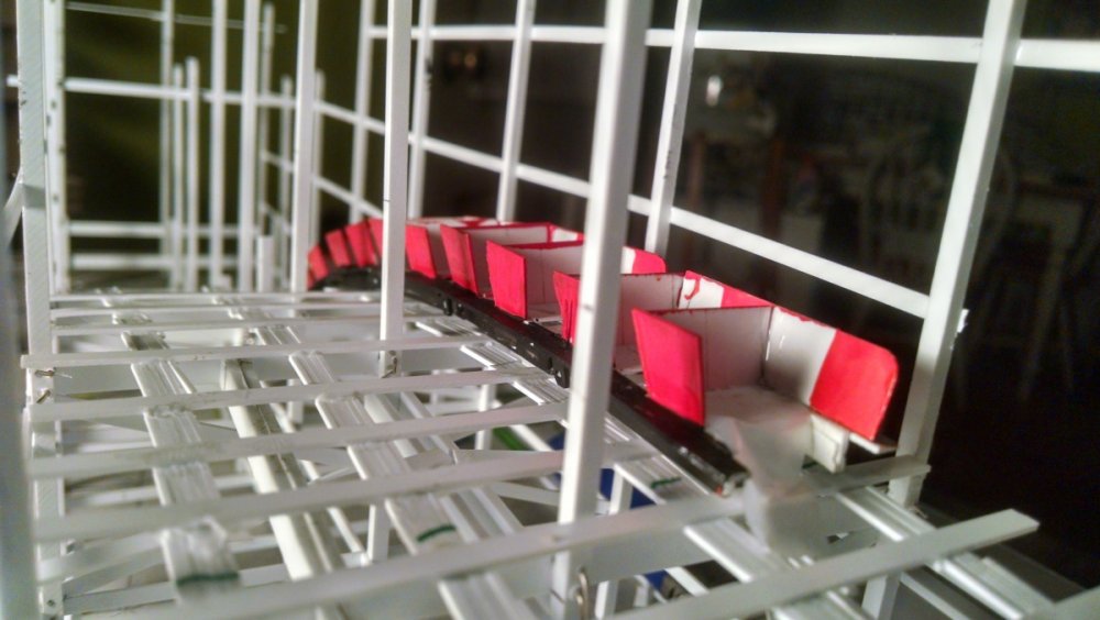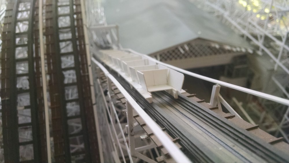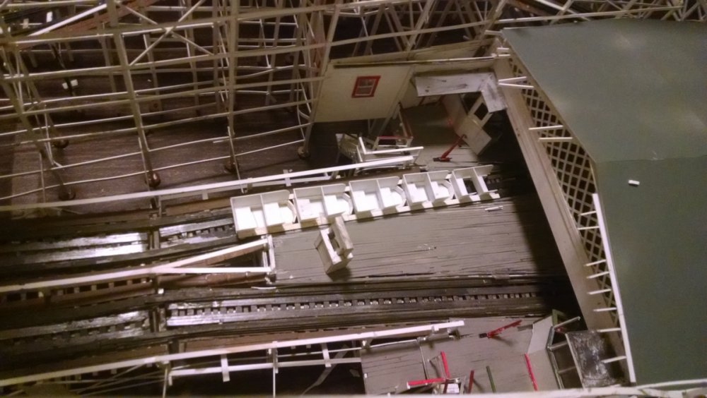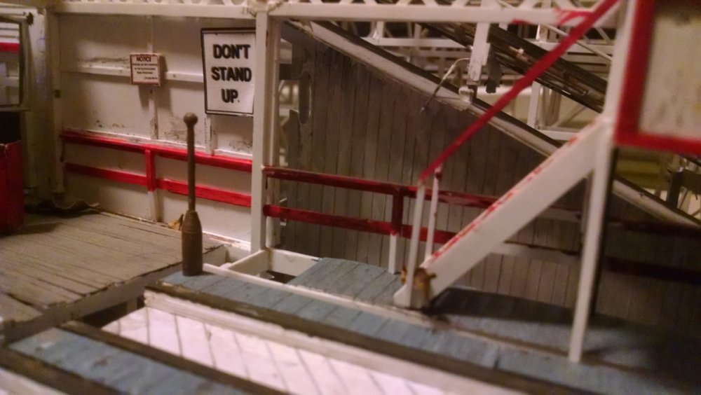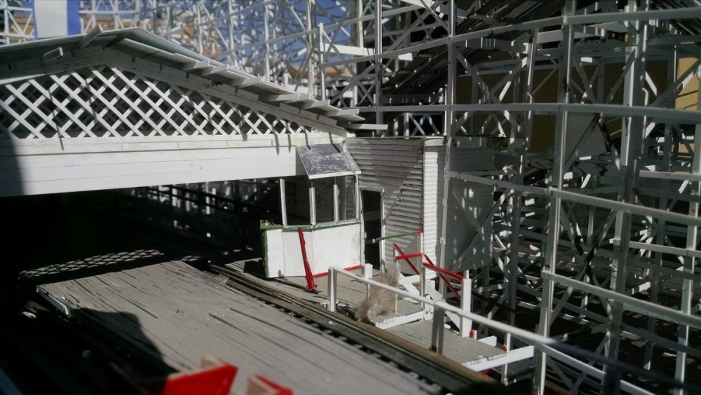 Station house detail shots, and what I call 'the gear box' actually, the sprocket wheel at the turning point of the lift chain. The bottom of one of the lift hills. Here is where I need to install some sort of home for the bottom return wheel for the drag chain. So I started by making a little gear thingy. While the bottom wheel probably had a groove, I think my cog wheel will be just fine. Then I made a couple of boxes. I tried to make them look like they've been in use for about 10 years All this trouble and NOBODY is going to see it except for my followers!! I LOVE my brake handle. The foot catch is an accidental shaving of plastic as is the little hand grasp. Prior and Church transfer tables always had nicely carved levers. Drama The train release handles Handrails down the exit stairway back to the drawing board. Much much better. Time to paint. A little funny photo of me playing inside the station. “Everyone hold on!!” This photo (if you look way in the back, the red side rails wobble) caused me to rethink how my side rails alongside the station line up. They don’t to my satisfaction so -