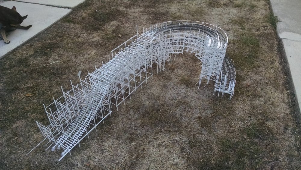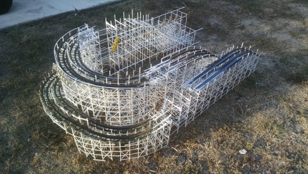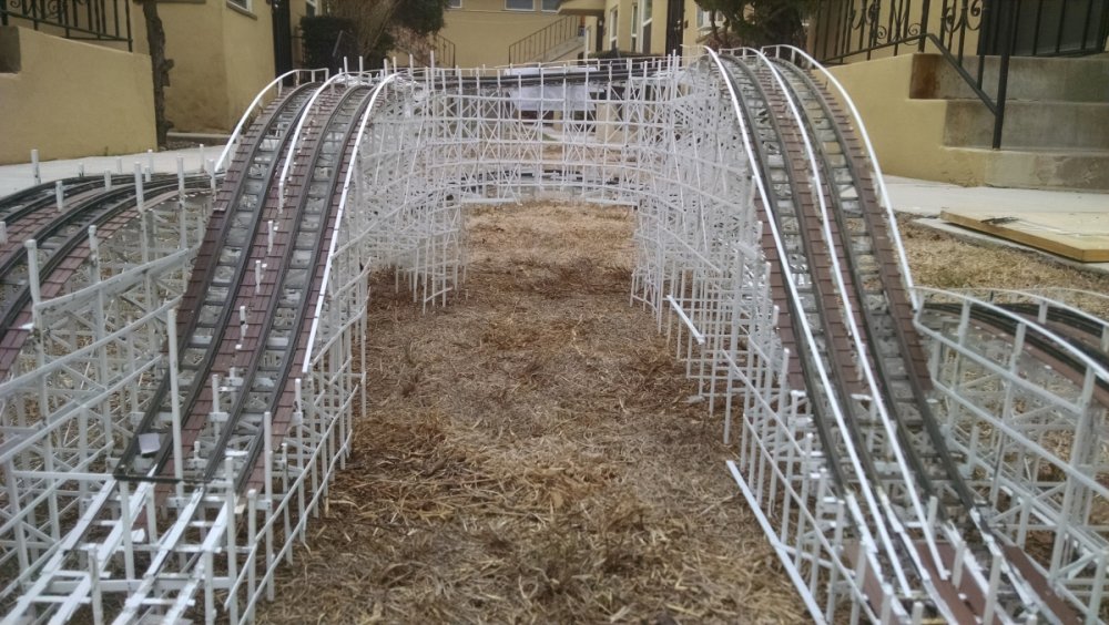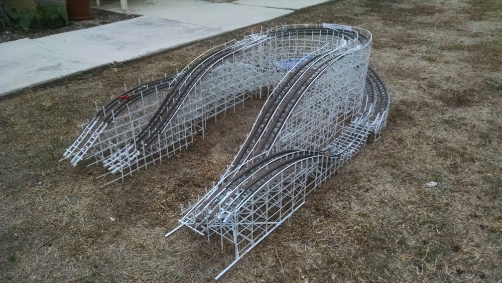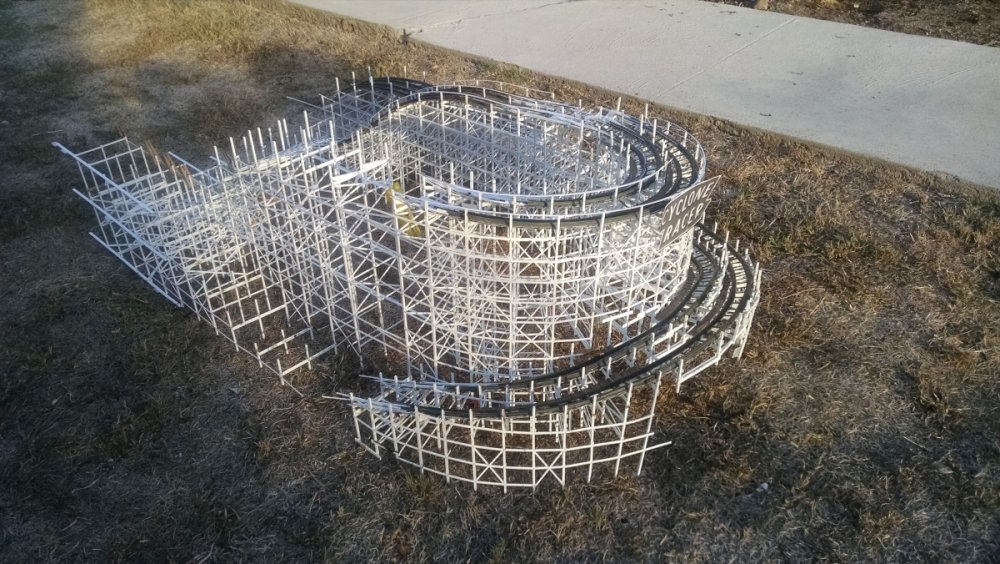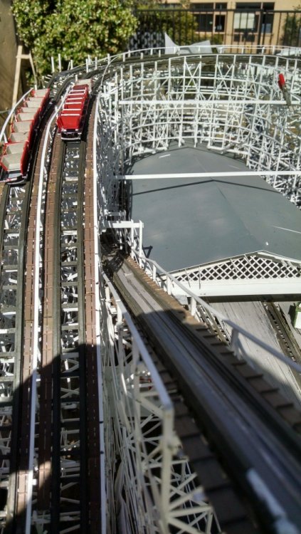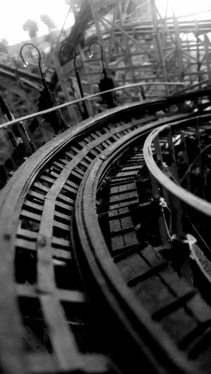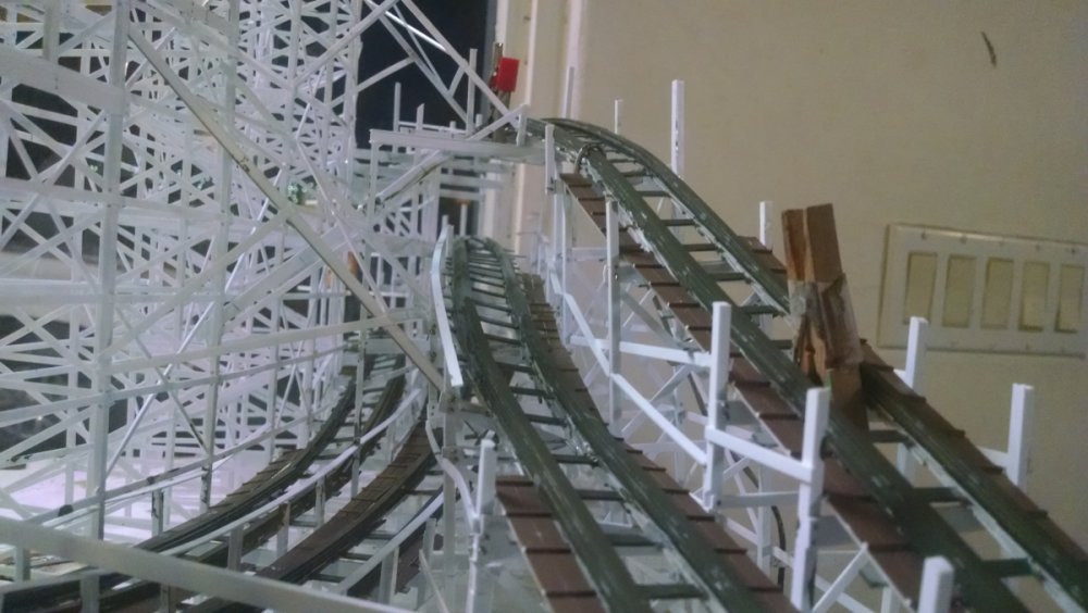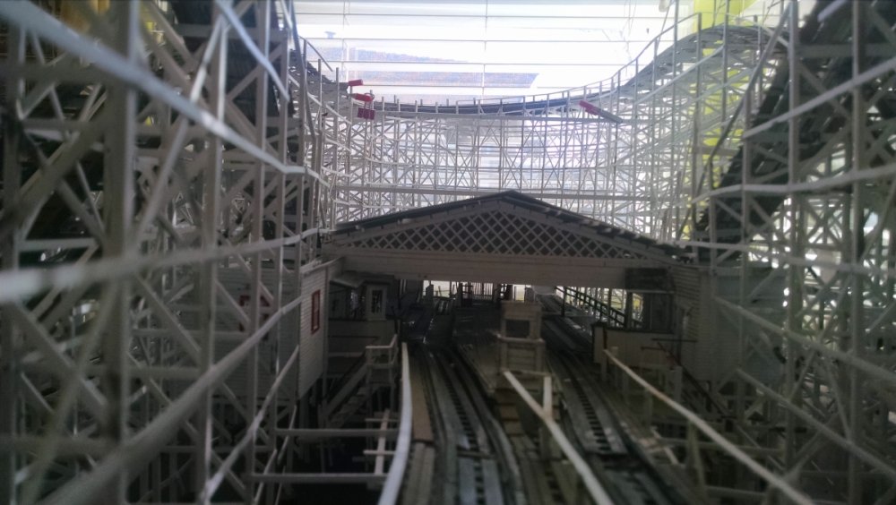 In commemoration for today, the 49th anniversary of the Cyclone Racer's last day of operation. Last time I think I left us with a photo of a shot of a big hole in the middle of my turn around. I finally got the guts and tried setting it on top of the station house to test how it will fit. The initial setting was good, the only difficulty was keeping track of all post clearings at one time. I still need a good break from this section. I need to finish the inside of the station house before I can secure the roof before I can permanently affix the turn around. It sounds like a lot to do, and it might be, but I hope it’s not. So in the mean time I weaved together more sub track for the exit out of the u turn. Underside shot of how it’s supposed to look. Topside shot, obviously. The midcourse brake area before adding the mechanics The midcourse brake area after adding all the mechanics Pictorial update. The end of the Cyclone Racer. The North end to be more specific lol. -