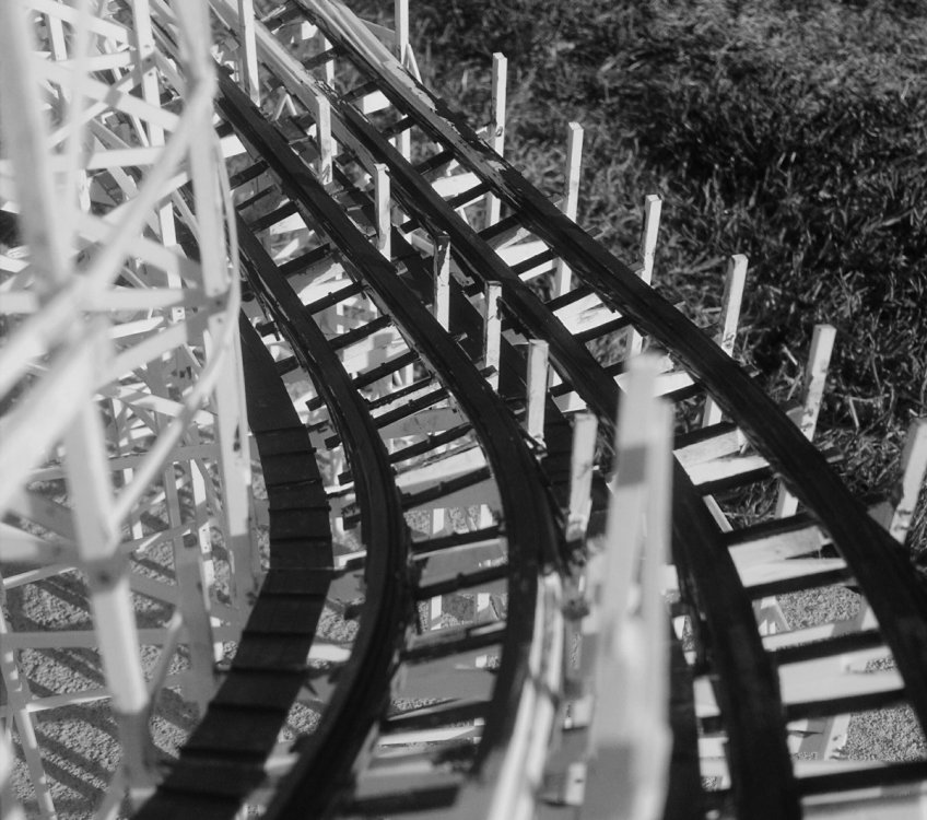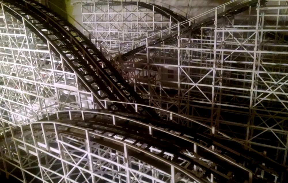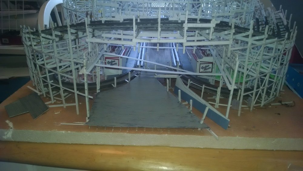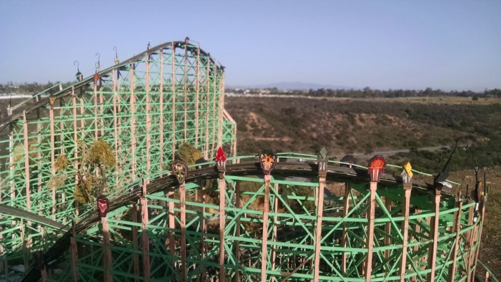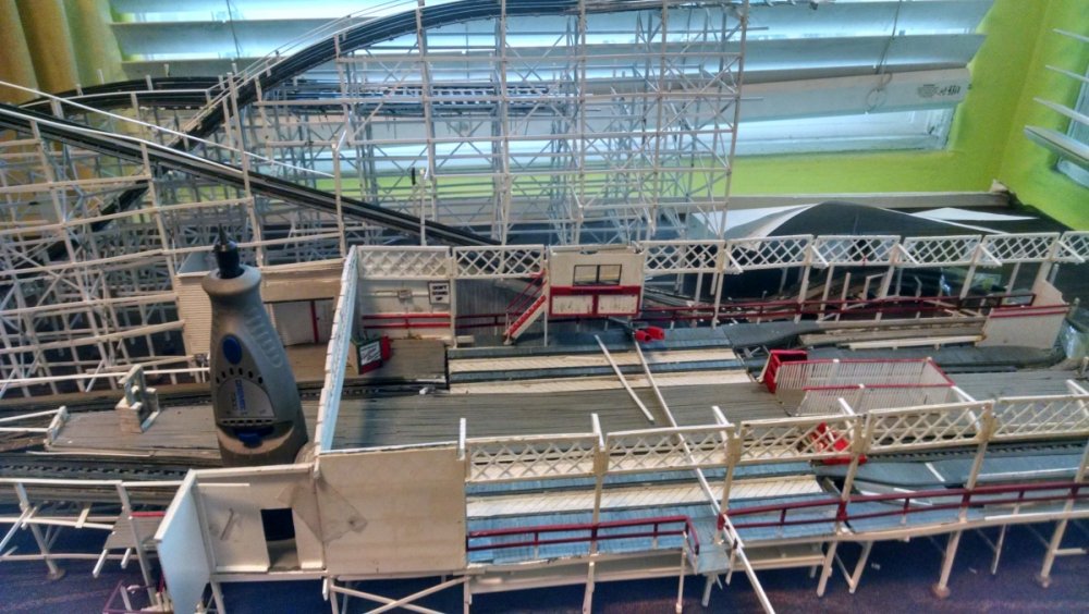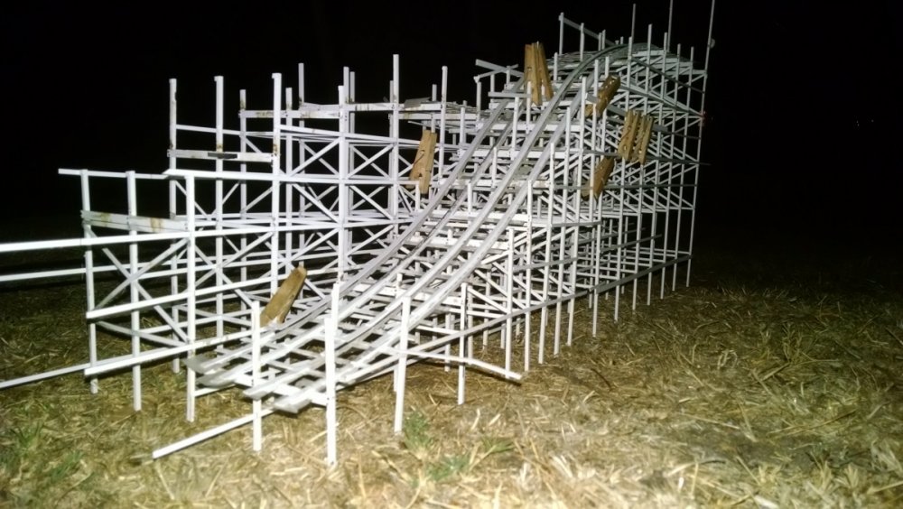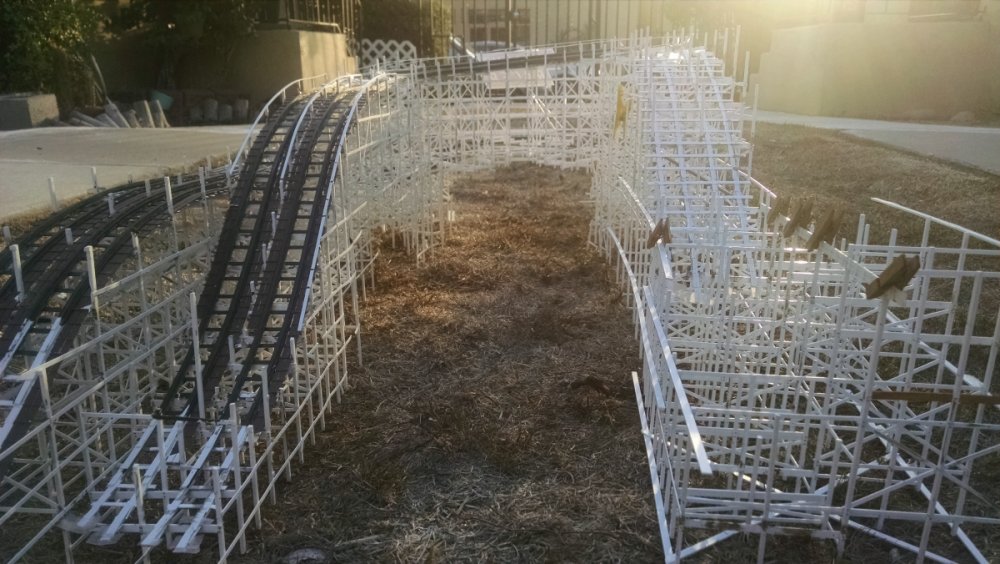 In commemoration for today, the 49th anniversary of the Cyclone Racer's last day of operation. Last time I think I left us with a photo of a shot of a big hole in the middle of my turn around. I finally got the guts and tried setting it on top of the station house to test how it will fit. The initial setting was good, the only difficulty was keeping track of all post clearings at one time. I still need a good break from this section. I need to finish the inside of the station house before I can secure the roof before I can permanently affix the turn around. It sounds like a lot to do, and it might be, but I hope it’s not. So in the mean time I weaved together more sub track for the exit out of the u turn. Underside shot of how it’s supposed to look. Topside shot, obviously. The midcourse brake area before adding the mechanics The midcourse brake area after adding all the mechanics Pictorial update. The end of the Cyclone Racer. The North end to be more specific lol. -
