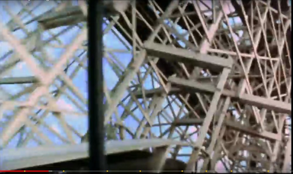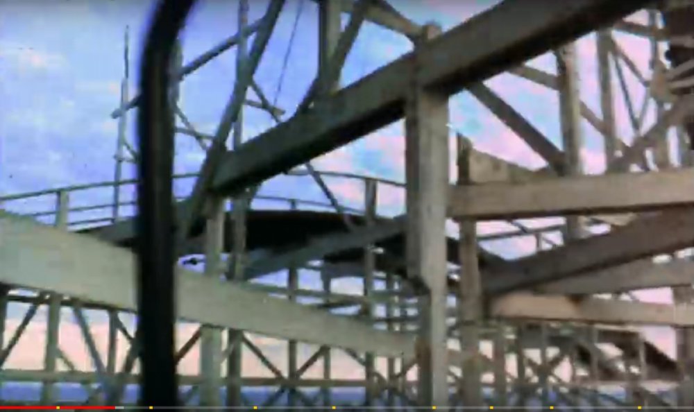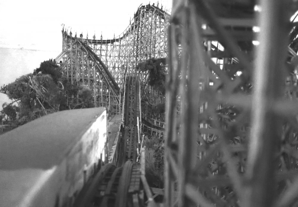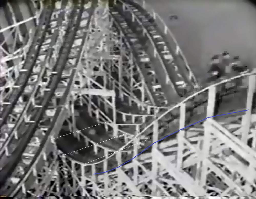 Trying to dissect the bulky middle portion of the Cyclone Racer, including the lift hills, the slicing hill, over the entrance to the brake run. Footings, some art shots of Airplane: I’m going to make a mini-test version. So I use plastic sticks to stick into where each vertical posts would touch the ground. The posts that wouldn’t touch the ground (or they would pierce the track) are colored red. The red posts I know have to have some kind of header that will have to support it. Figuring out which posts are used to support other posts looks very challenging. I added the black horizontal ledgers per the ones that I can see in the photos. I simplified the plan for the midsection of the Cyclone and colored each path starting with the upper portion dominating over lower paths. When I link two sections together, splicing the track will be really easy compared to how I was doing it on the Airplane. Adding footings. Most of my work for the next three weeks will be affixing all three sections on to the station house base. That is one of the lift hills. This section with footings will overlap the lift hill. When I link two sections together, splicing the track will be really easy compared to how I was doing it on the Airplane. A little cleanup is necessary but otherwise, very close with the film frame below. Test fitting the opposite side. In the foreground is the hill that leads up to the turnaround. A couple of Airplane photos You can expect to see this shot again once I add the handrails All the glue I’ve used thus far I love this one From "Strike Me Pink." Here is the area I'm trying to reassemble. You can see two hill tops that seem to appear buried under the lift hill, but it's the one The best source for this area is a shaky, but nice, POV footage used in the 1964 Cult classic, "The Incredibly Strange Creatures Who Died and Became Mixed Up Zombies." For the supports that cannot be discovered in any clear photo of film frame, my best educated guess will have to do. And from someone familiar with Fred Church’s tricks, that will be a real bona fide educated guess. -