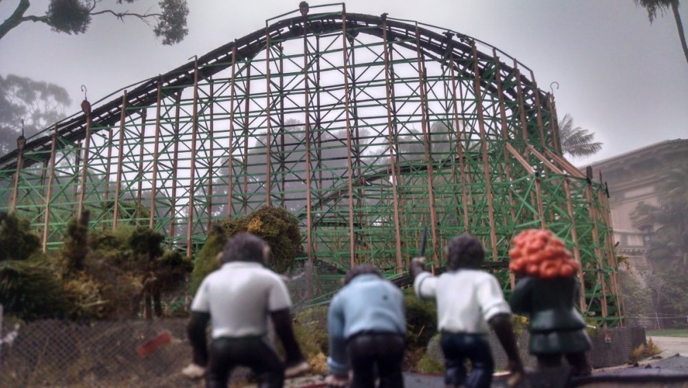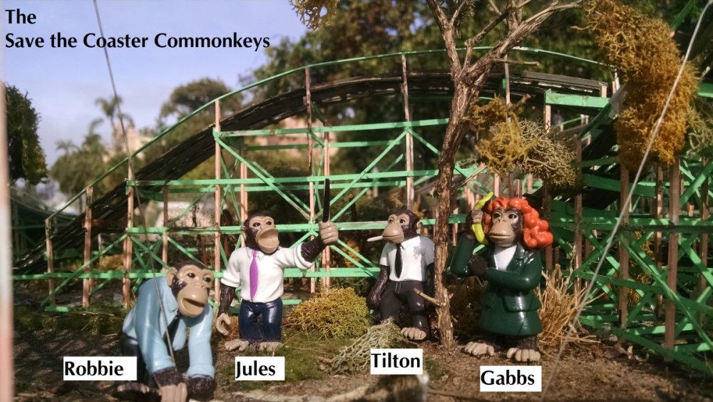 It was only the year 2025, exactly half a millennial away from when Zager and Evans' musical prophecy begins the disintegration of mankind that was to last 7070 years before Christs' second coming. 7070 years worth of portents condensed into 56 years. Life didn't end well for the humans. It wasn't a war, it wasn't a single natural disaster, there was no rapture. no second coming. Just one errant computer hacker who unwittingly brought all of the worlds countries to a halt with one stupid stroke of a key. Ironically the third world countries, which didn't depend on the Alien's gift of technology, survived the longest. But they too, eventually died off after several new diseases arose from the millions and millions of dead lifeless corpses. Right before it all, society had been trudging along as normal. Political turmoil, crimes, traffic, rising costs of living, the latest in computer technology, just all part of every day life. Amusement parks were thriving. The successful peaceful end to 2020's World War 3 just minutes before complete global annihilation was the cause for partying and celebrations in each nation. People were once again daring to get a little reckless. The Airplane roller coaster was even rebuilt near a zoo in San Diego and ran successfully for five years until... Now the year is 2075. The human race has been long gone but not all life is extinguished for you see...for years they have been watching us, studying, learning from our ways, waiting for our eventual demise before they can take over. The children of the world, the forgotten chimpanzees...this here is their day to rebuild what once was. They monkeys only heard of the legendary beast that overlooked the Florida canyon right outside their zoo. Time and overgrowth have made the search difficult but...finally one day. The Save the Coaster Commonkeys The Airplane was rebuilt in the spot where the Blue Streak Racer once sat in 1915 in the spot that would later become the San Diego Zoo. It was based on the 1927 creation that once stood at a park called Rye Playland, seen in this old photograph. The brand new Airplane during a test run in 2020 After mankind was wiped off the face of the earth, so were his pleasures to follow. Soon the plants took over, obscuring the coaster from view. It was a nice fit for the zoo. Imagine cresting over the lift hill as you look into the chasm of nearby Florida canyon. Now our friends the Save the Coaster Commonkeys are on a mission, to restore the Airplane roller coaster. -