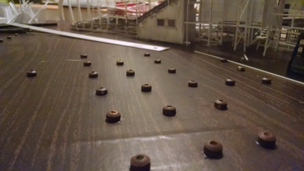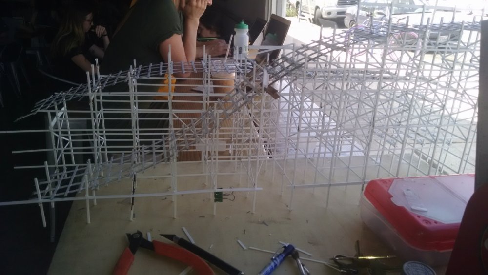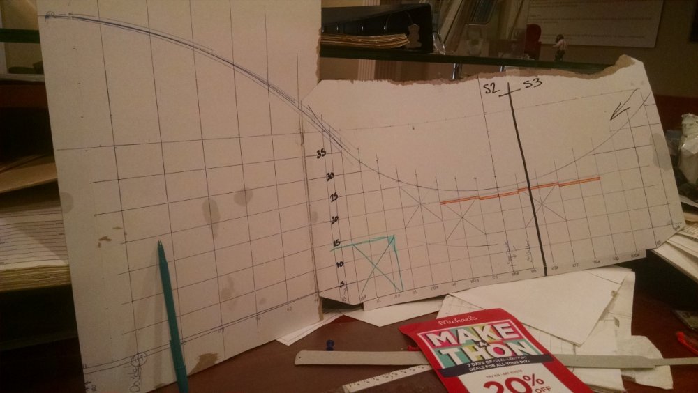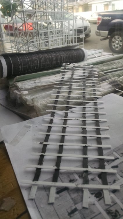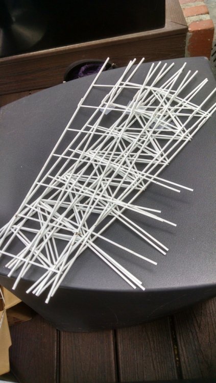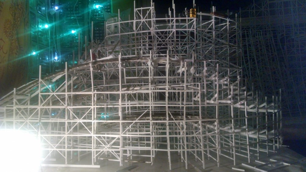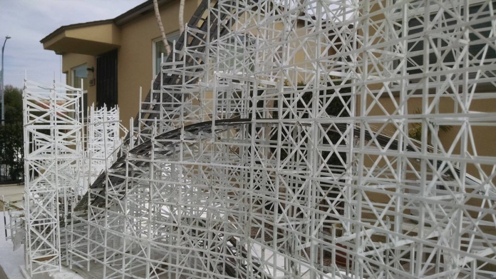 Another recognition honor at my 3rd year at the Annual Maker Faire. The newest addition is the basic frame for the lead to the U-turn over the station house ® and the beginning of the final lap (l). Handmade sheets of catwalk and track base. I was watching 2 Broke Girls the other night (guilty pleasure). One of the characters, Max, was chewing on a candy necklace and that reminded me that I once used a candy necklace for footings on a model I did in 1985 of the Belmont coaster. So I broke a few necklaces and spray painted them brown. My blue ribbon and I at the Maker Faire I thought this was clever. While most people get the joke, very few REALLLLY get the joke. With the newest portion added The newest portion being fitted for track. Designing the profile for the next section to be built, hill #5 that carves under and through the lift hills. This area is going to be cross-over hell madness The portion of the model that was displayed at the faire. -