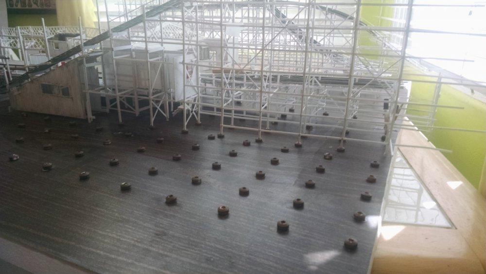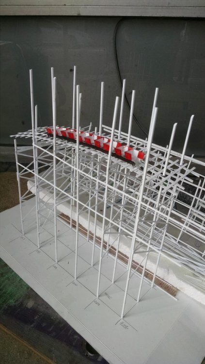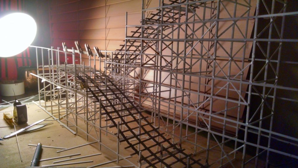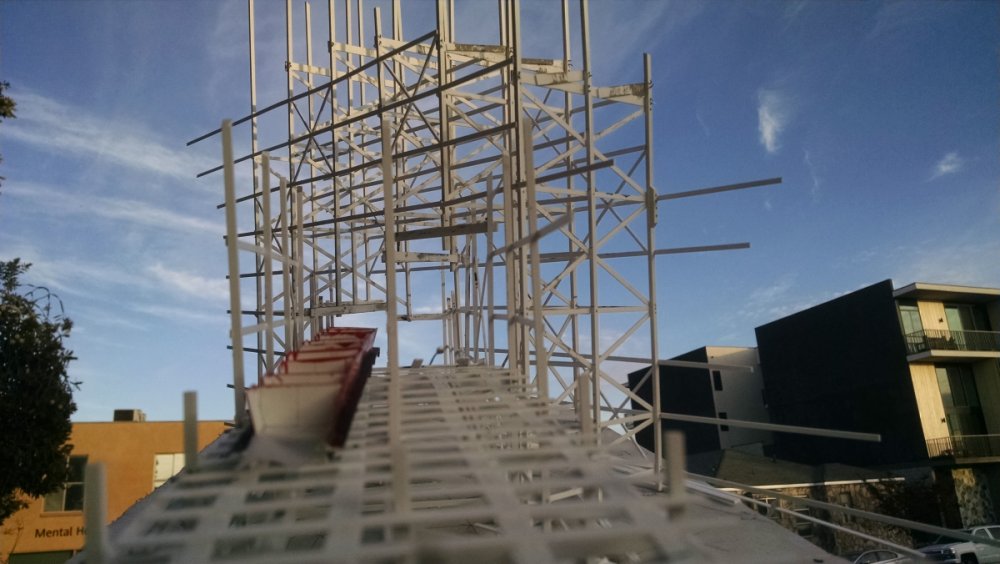An update on where the model stands in terms of construction. Don't be fooled, the parts I'm saving for last are uber easy. Once I finish that turn....Blue lines are track that exists on the model, the red are bents that are up, just not tracked yet. Art shot. Would be August in a calendar. -