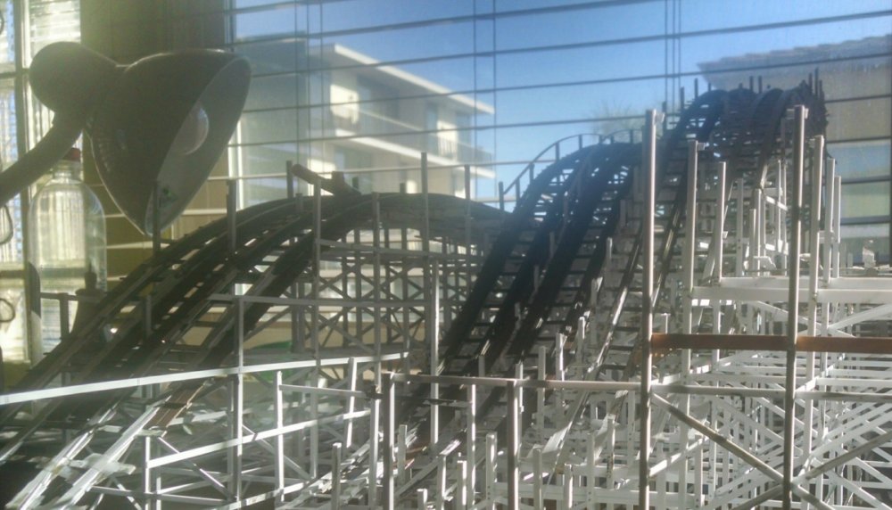 Track making, and building the flanks entering and exiting the flat turn over the station house. Ugh. Time to weave some coaster track. The big hill in the middle is the new track. The adjacent run on the right is about to get some. Subtrack on the right A good shot of the under the track A show and tell section of track that people can handle. I made it for the Maker Faire but lost it until recently. Okay, here are a couple arty ones As of Wednesday, three sections before you. Not pictured: The station house and lift hills Here are a few shots to fool your friends in a “guess the coaster” quiz The hill buried way under the lift hill will be the next section to be built. It is REALLY buried inside and under the lift hill so it's hard to 'get in' there for a good view. Stay tuned for how I have figured out how to figure it out. -
