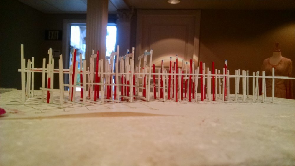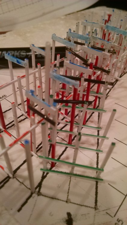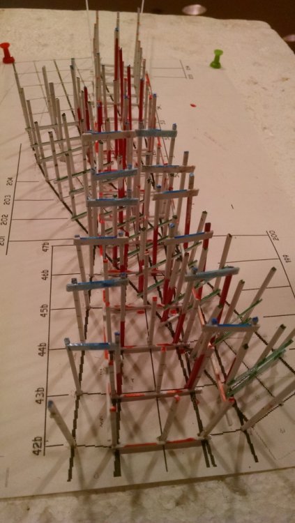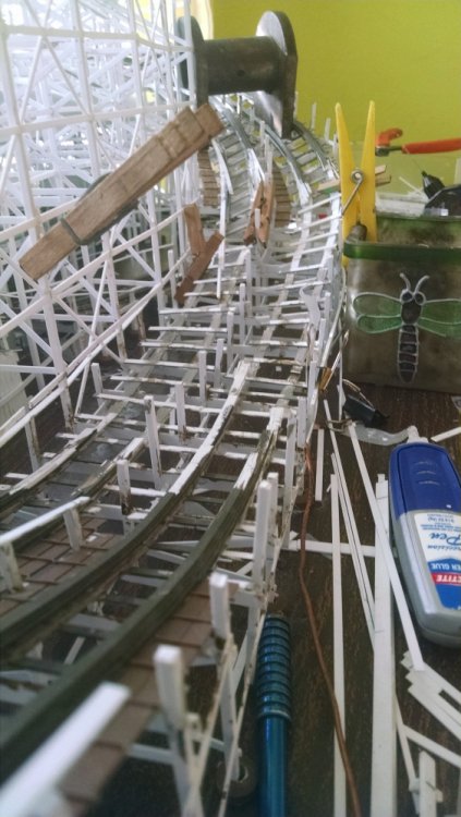 . Cutting sticks against profile design. The final dip before leaping up to the brakes. The tall supports are to help support upper structure. The bent with the 3 clothes pins is the bottom part of the tallest lift hill bent. Did a little paint job on the cars. -